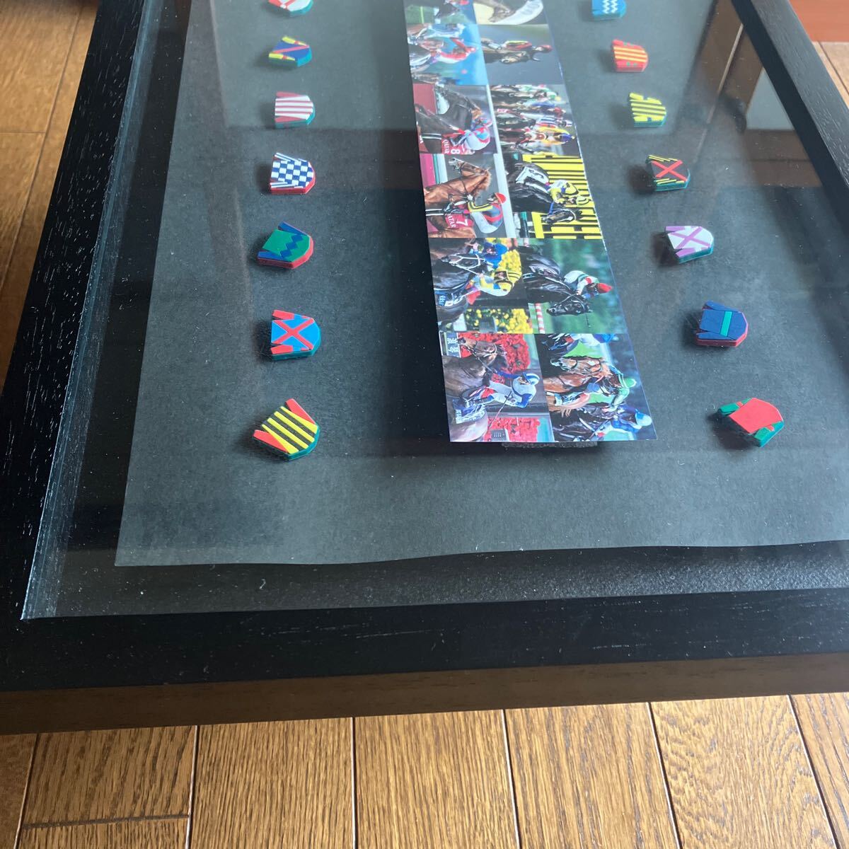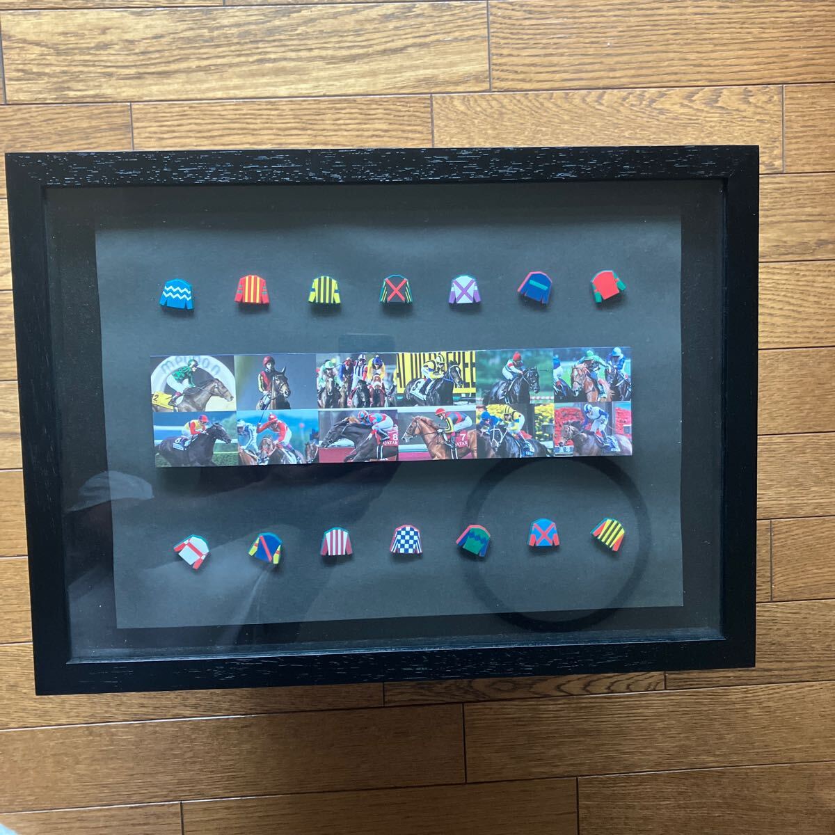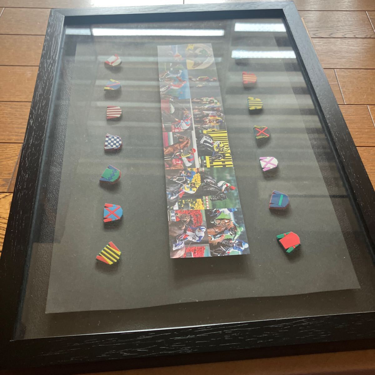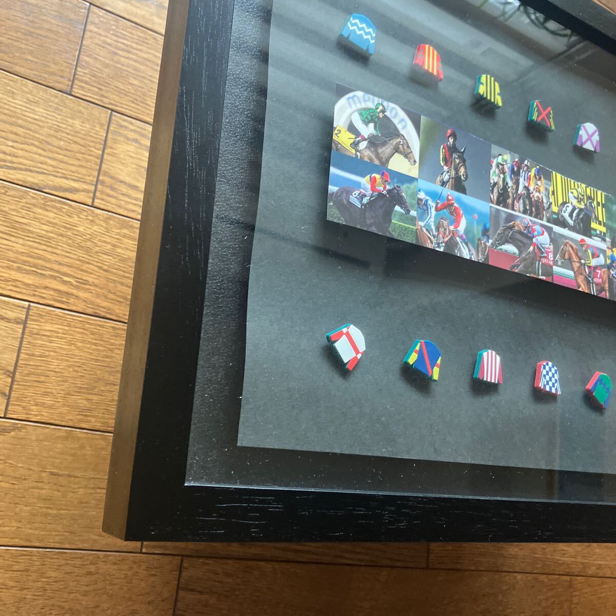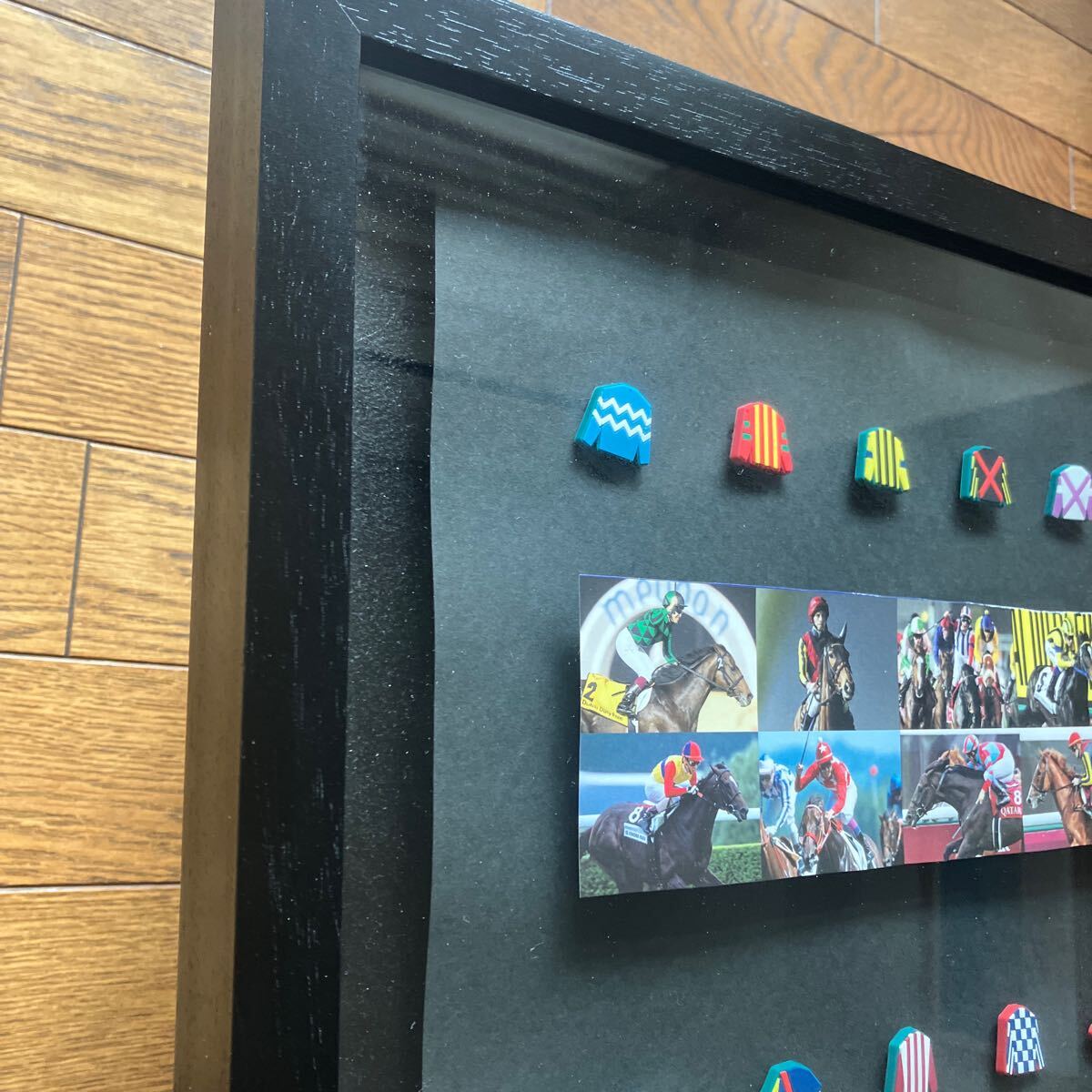 競馬勝負服イメージの額です。勝負服はカプコレのピンバッジを14個使っています。木製枠ガラス表面の額になります。額のサイズは、横40縦32.7奥行3センチです。