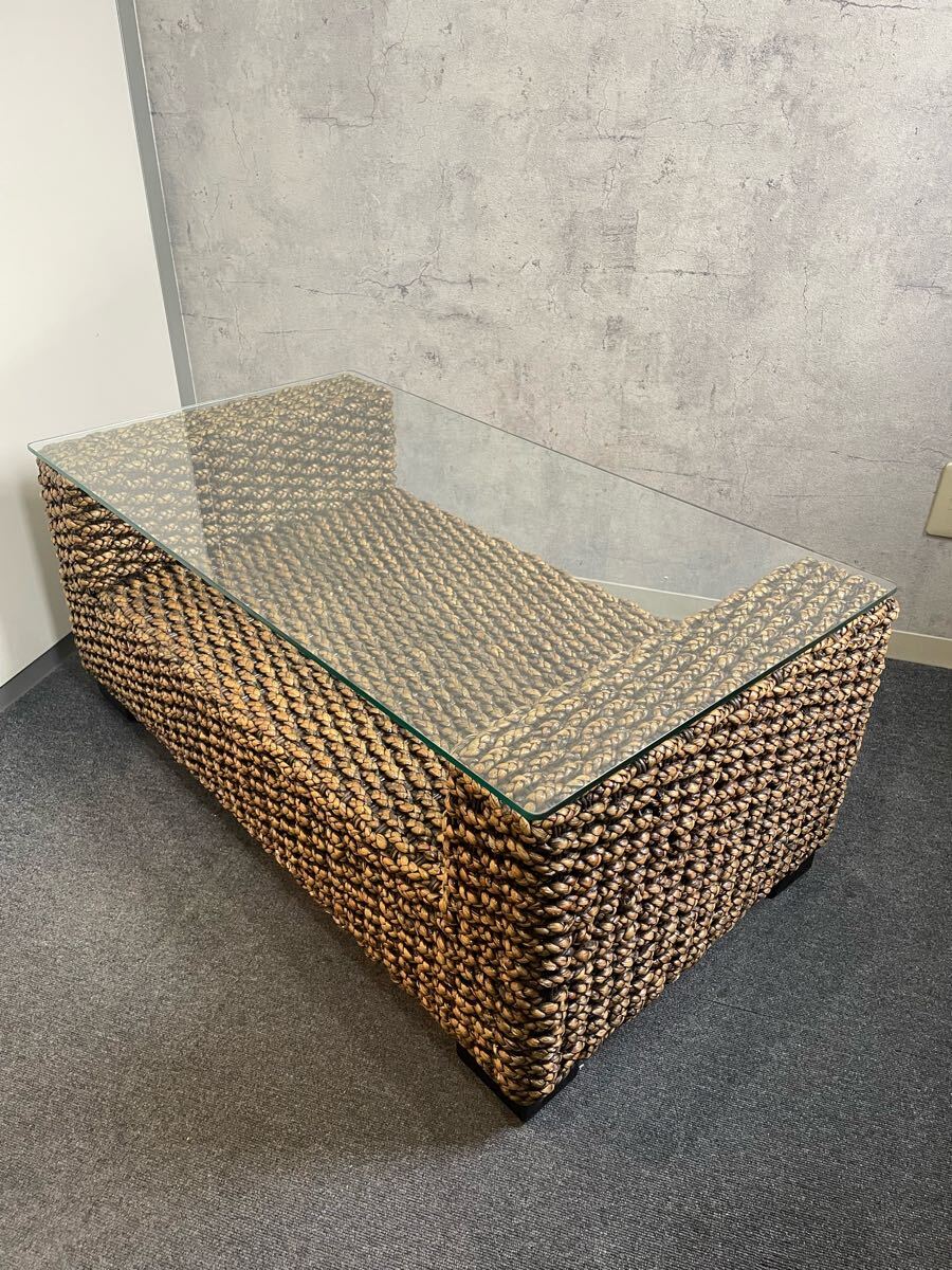編み上げられたウォーターヒヤシンス素材を使用されています。アジアンリゾートのような雰囲気が味わえます。天板には強化ガラスを使用。