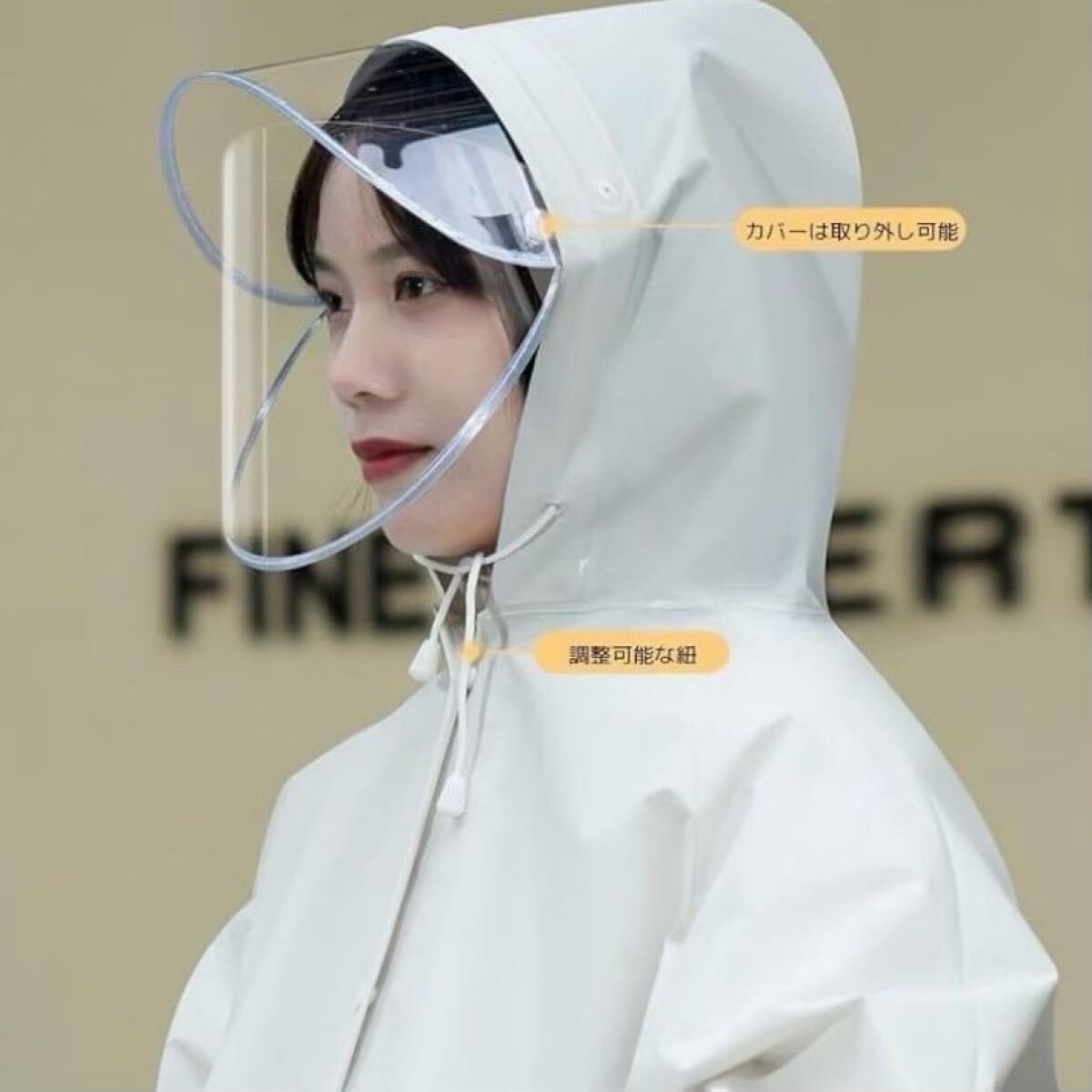 顔をしっかり守る二重つばと、取り外し可能な透明レインバイザー付き。雨や風から顔を守り、視界を確保します。