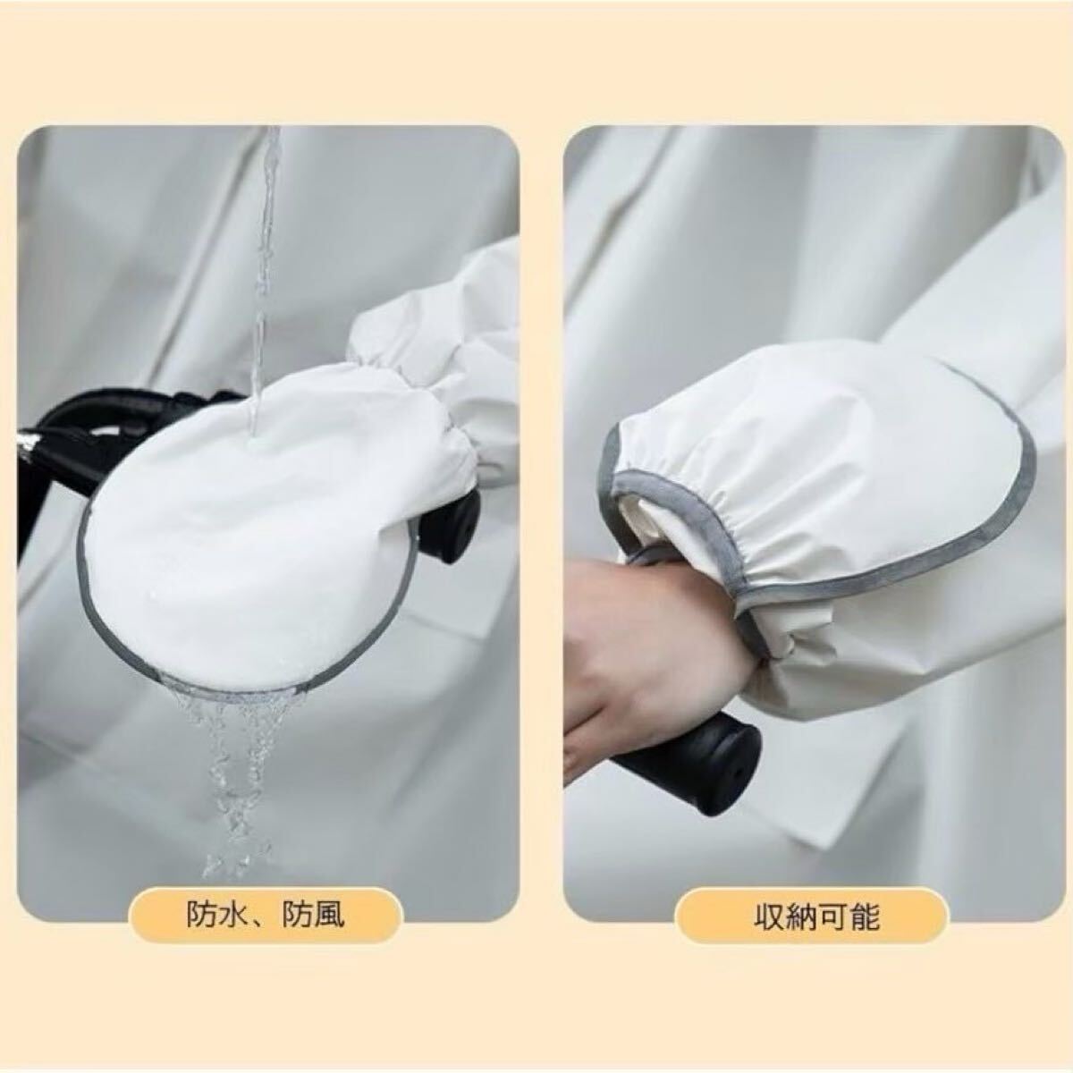 袖口はゴム仕様、ハンドカバー付きで水の侵入を防ぎます。
