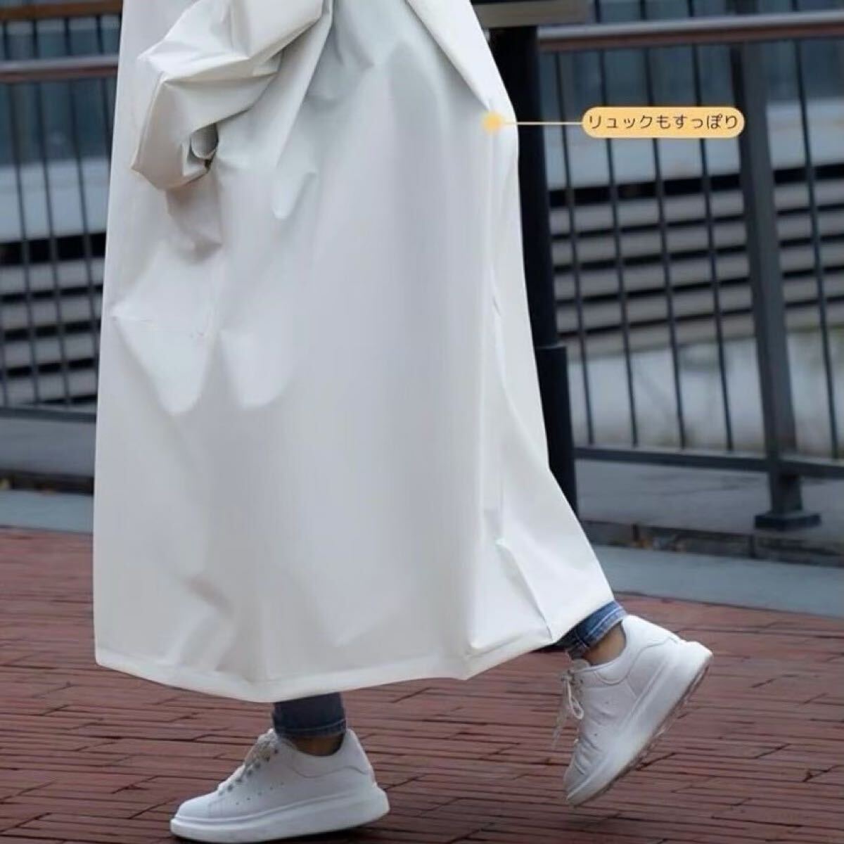 足元までしっかりカバーするロング丈設計で、雨の日も安心。