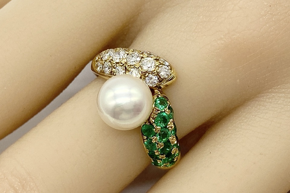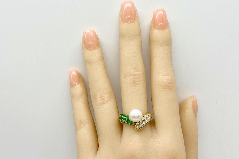 解説 | 珠表面に微細なスクラッチがありますが、テリは大変良好です。ダイヤもエメラルドも美しく、高級感が際立つ一品。ソフトなVデザインが、指元をエレガントに演出します。 |