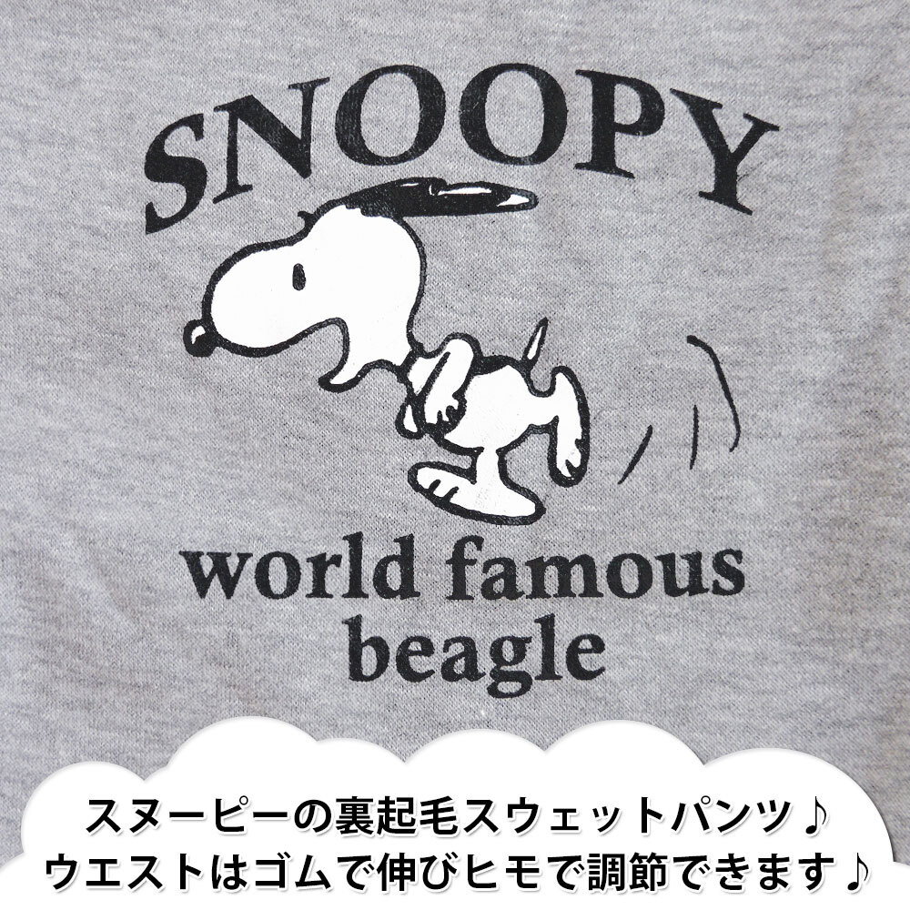 正規店仕入れの新品未使用品です 綿とポリエステル素材で、吸汗速乾に優れます スヌーピーの裏起毛スウェットパンツ ウエストはゴムで伸びヒモで調節できます |