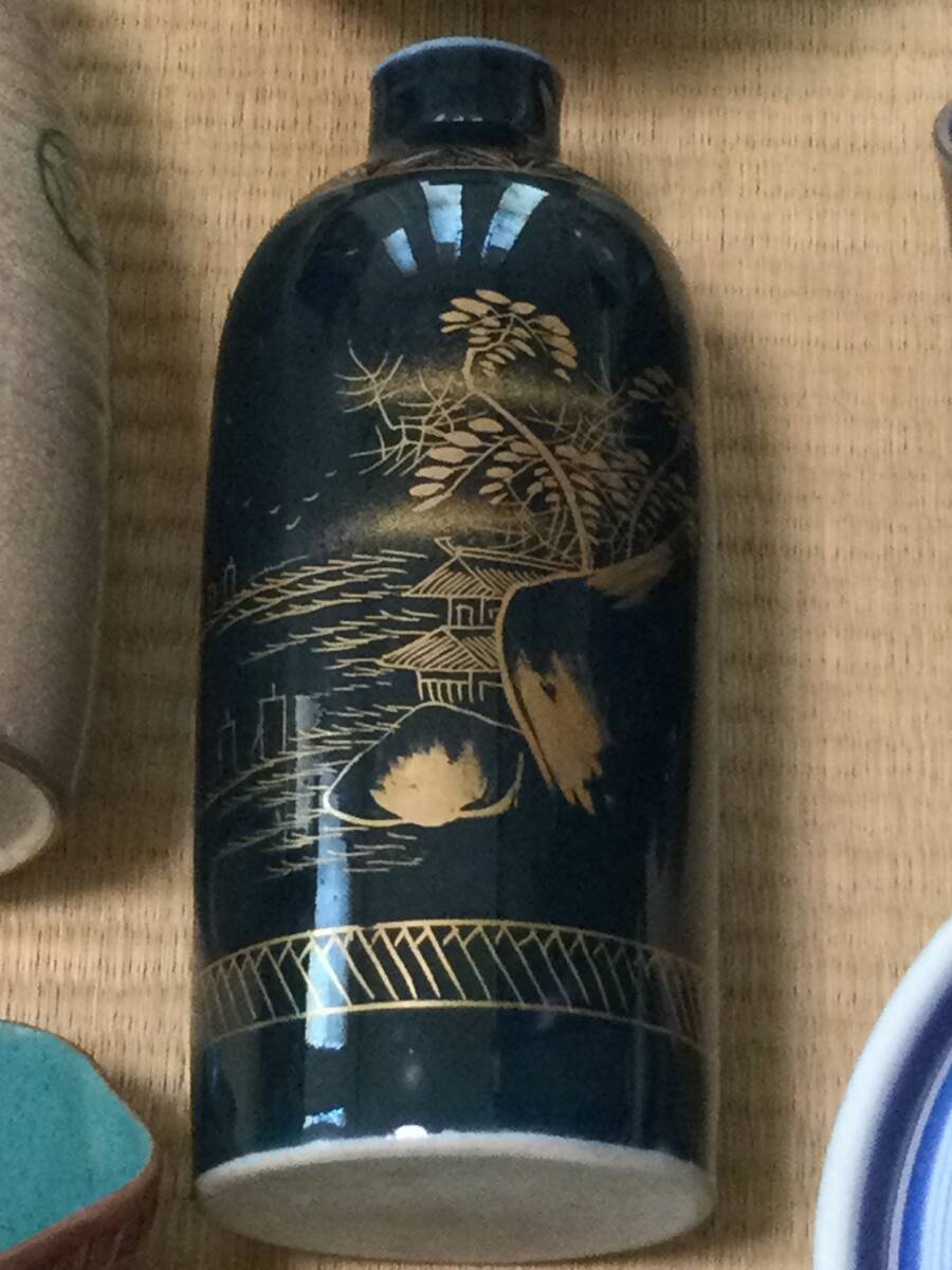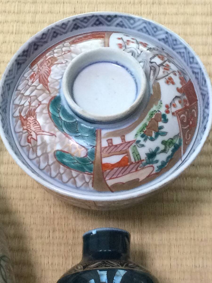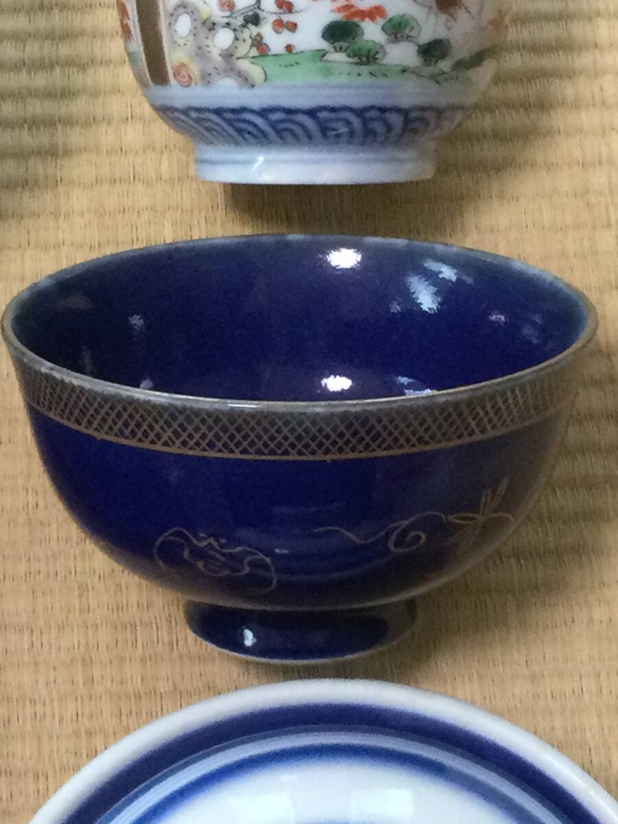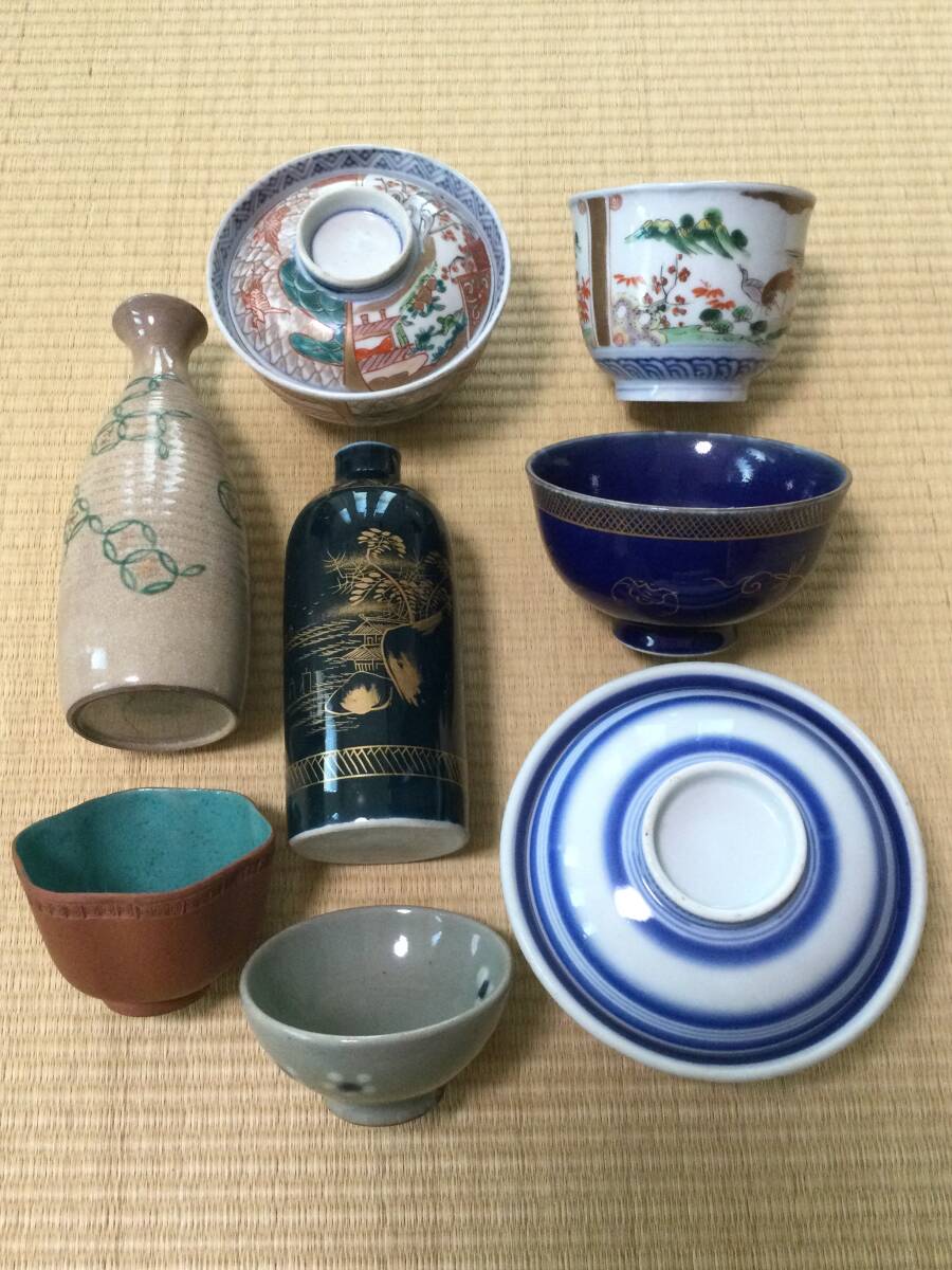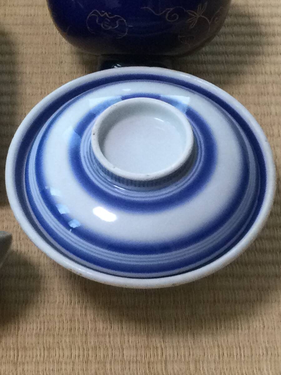 青い線の入った蓋付き茶碗の大体の大きさは蓋を被せた状態で12.7×7.2cmです。京焼の徳利の底にはニュウがあります。また、瑠璃碗飲み込みには直しがございます。それでも気に入られましたらどうぞよろしくご入札下さい。