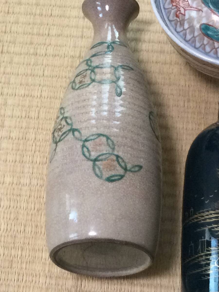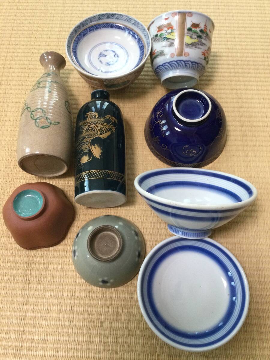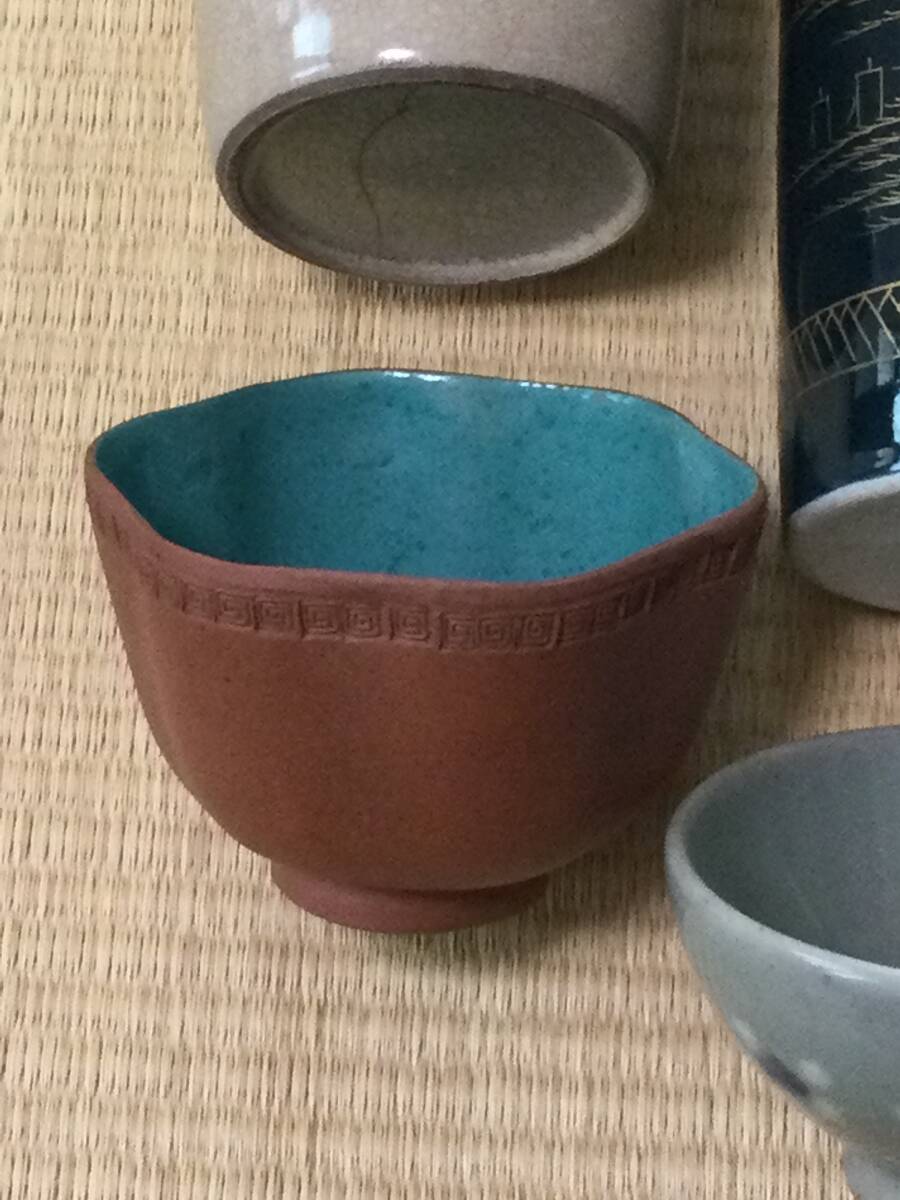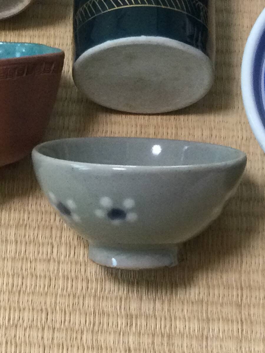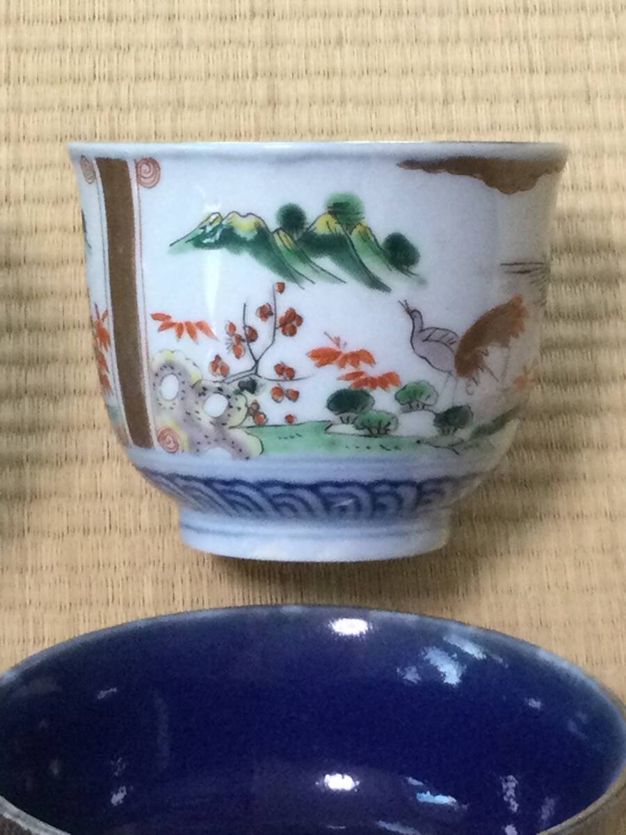 青い線の入った蓋付き茶碗の大体の大きさは蓋を被せた状態で12.7×7.2cmです。京焼の徳利の底にはニュウがあります。また、瑠璃碗飲み込みには直しがございます。それでも気に入られましたらどうぞよろしくご入札下さい。