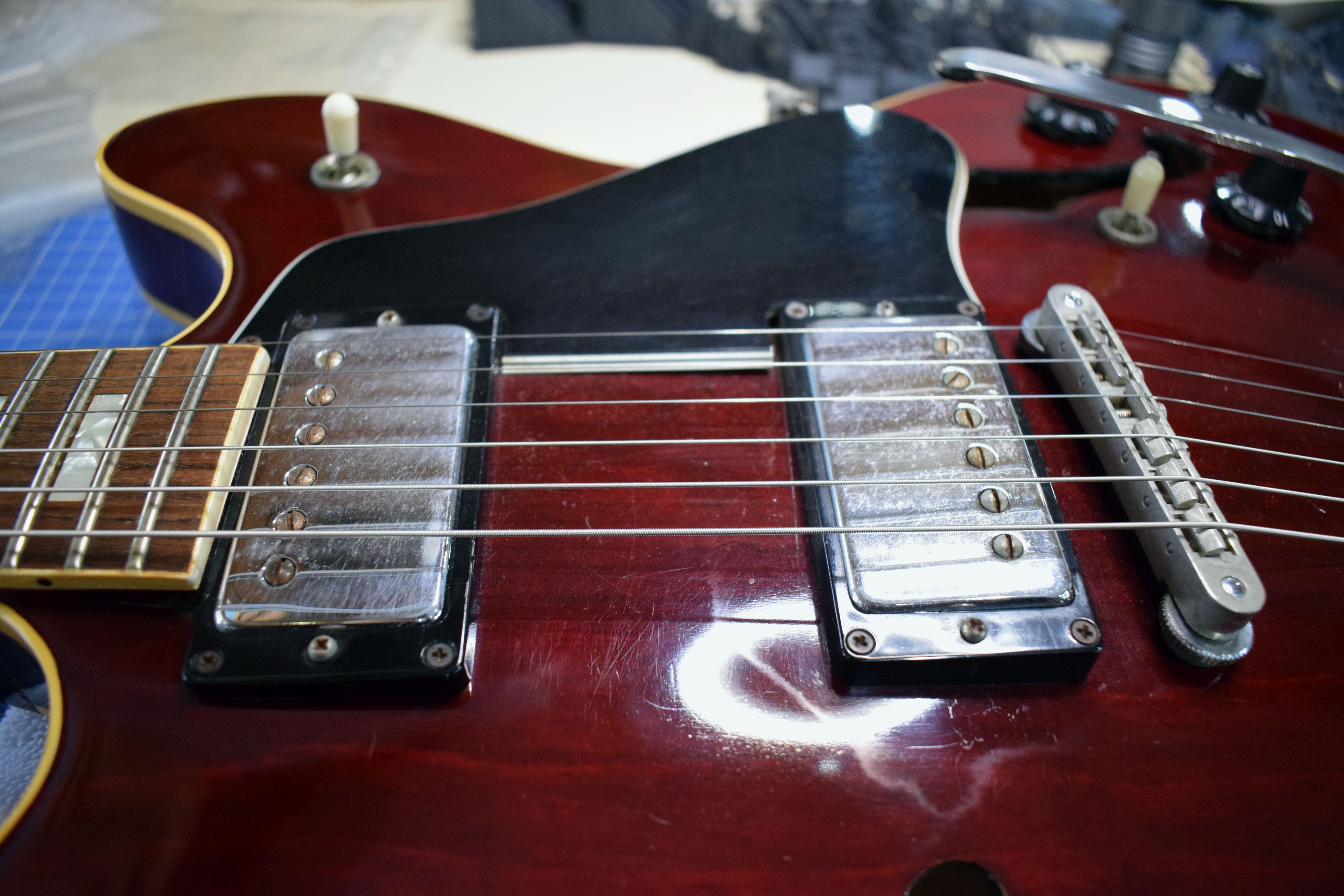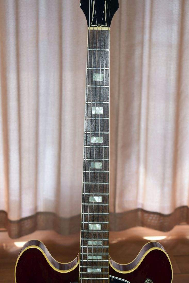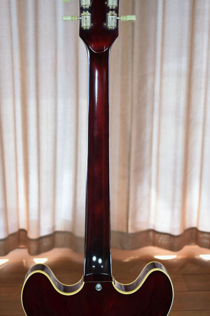 フレットは60%ほど残っており、滑らかである(深い溝はない)。リフレットはしばらく必要ないと思う。多くのヴィンテージES-335と同様、ネックジョイント部のエッジに塗装のクラックがありますが、このギターを所有して25年、ネックが動いたりチューニングに問題が生じたことは一度もありませんので、表面的なものだと思われます。私の知る限り、このギターに大きな修理は施されていない。
