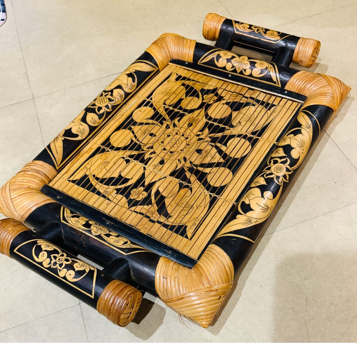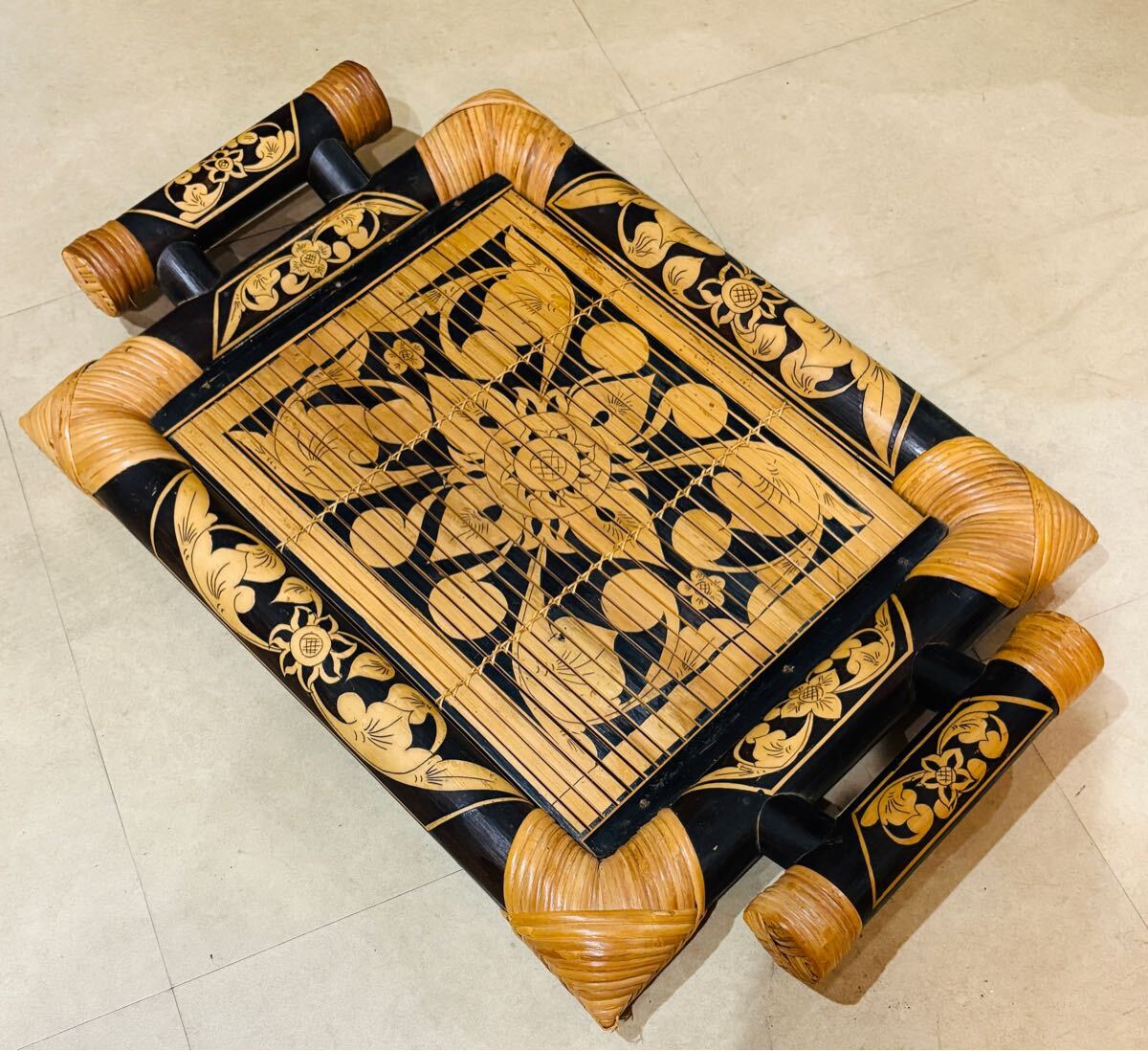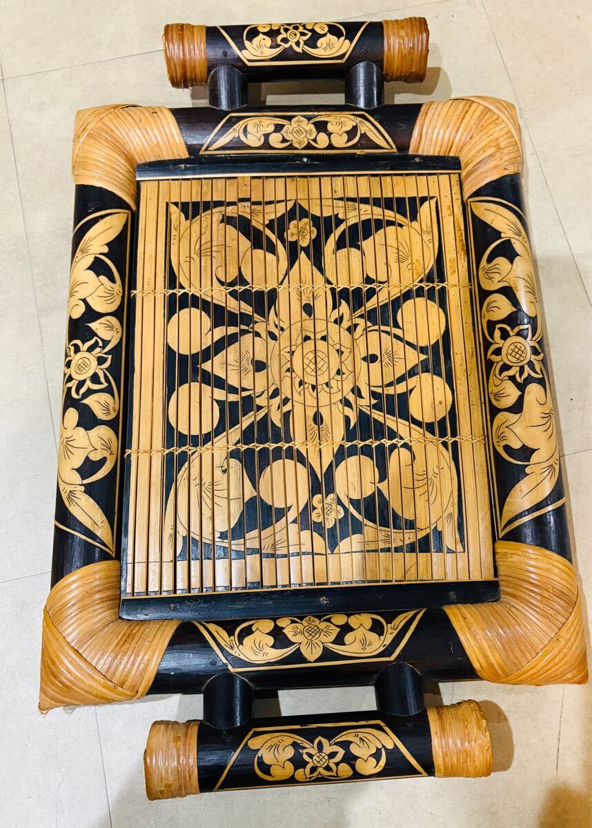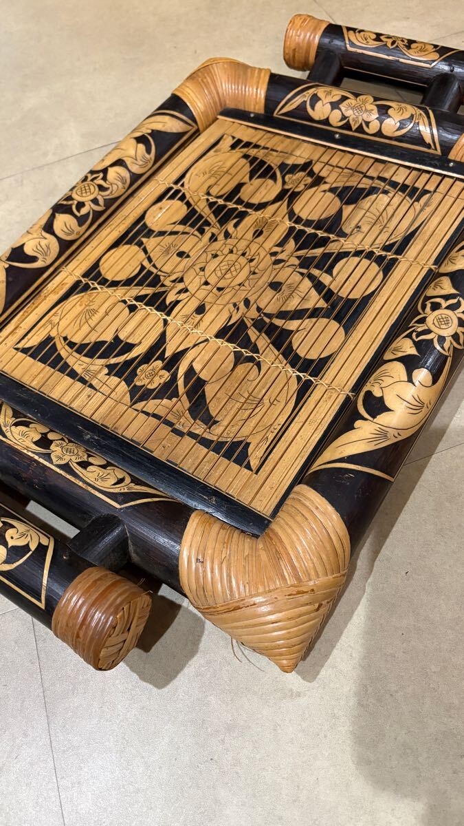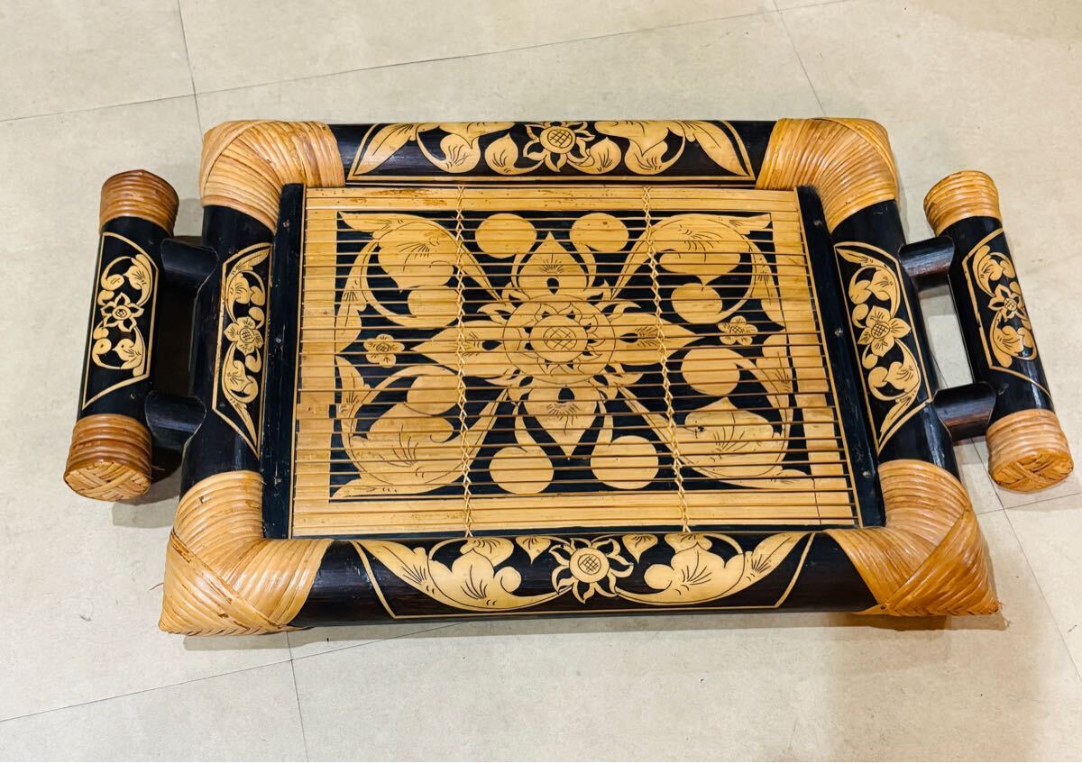 手彫りのアジアンスタイルの竹製トレー、装飾用にも実用的にも最適。