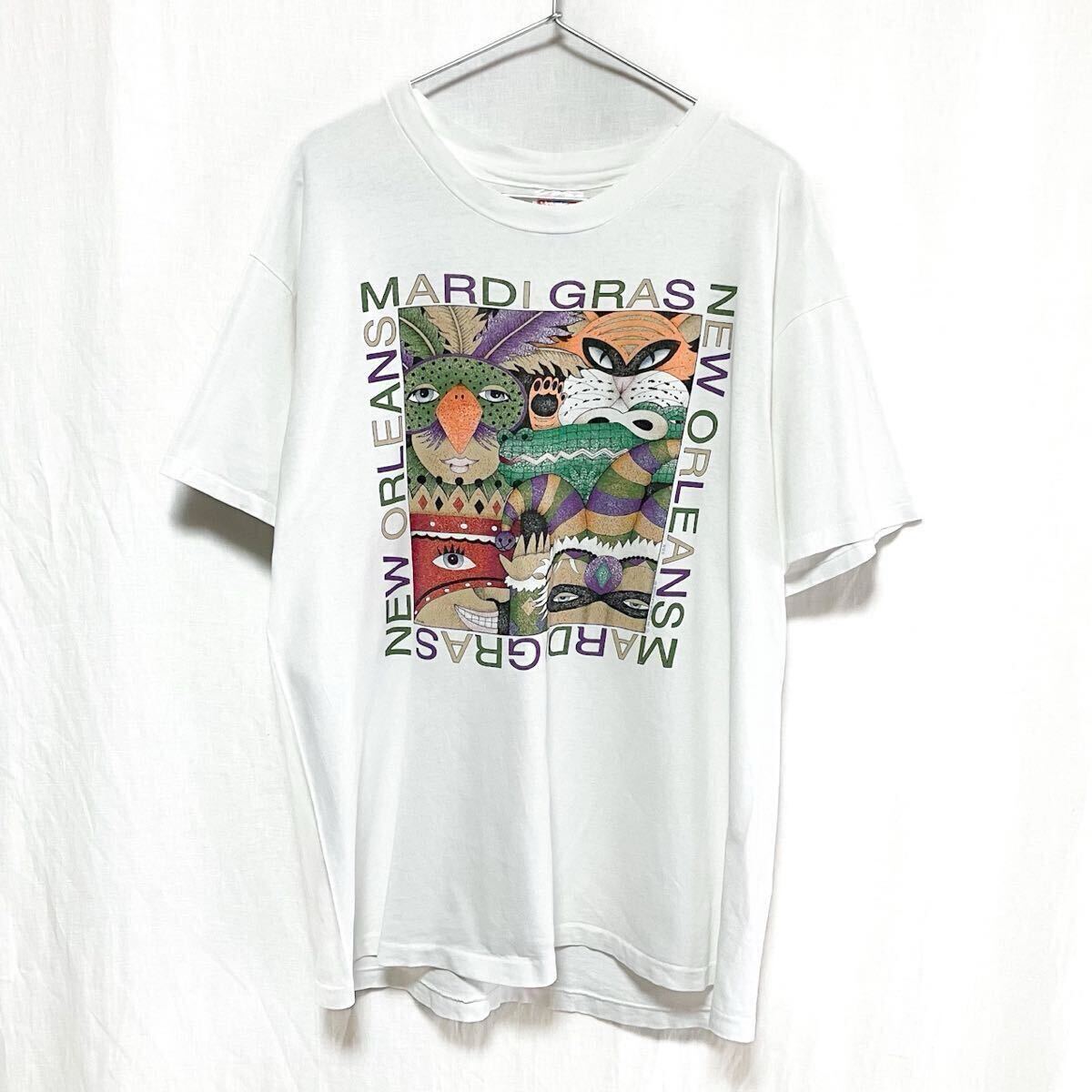 90s USA製 Hanes HEAVY WEIGHT ニューオーリンズ・マルディグラ カーニバル プリントTシャツ 半袖 Tシャツ 白 L