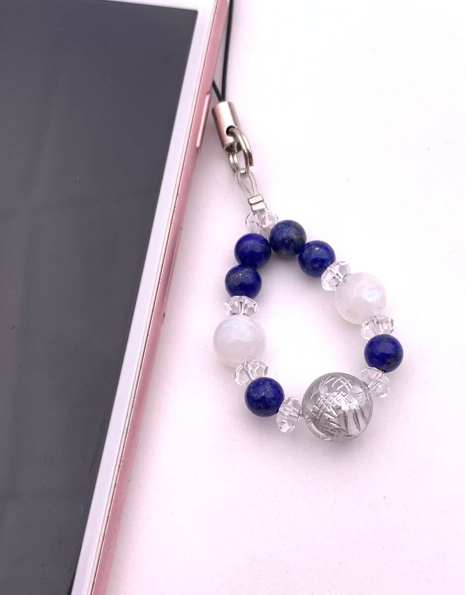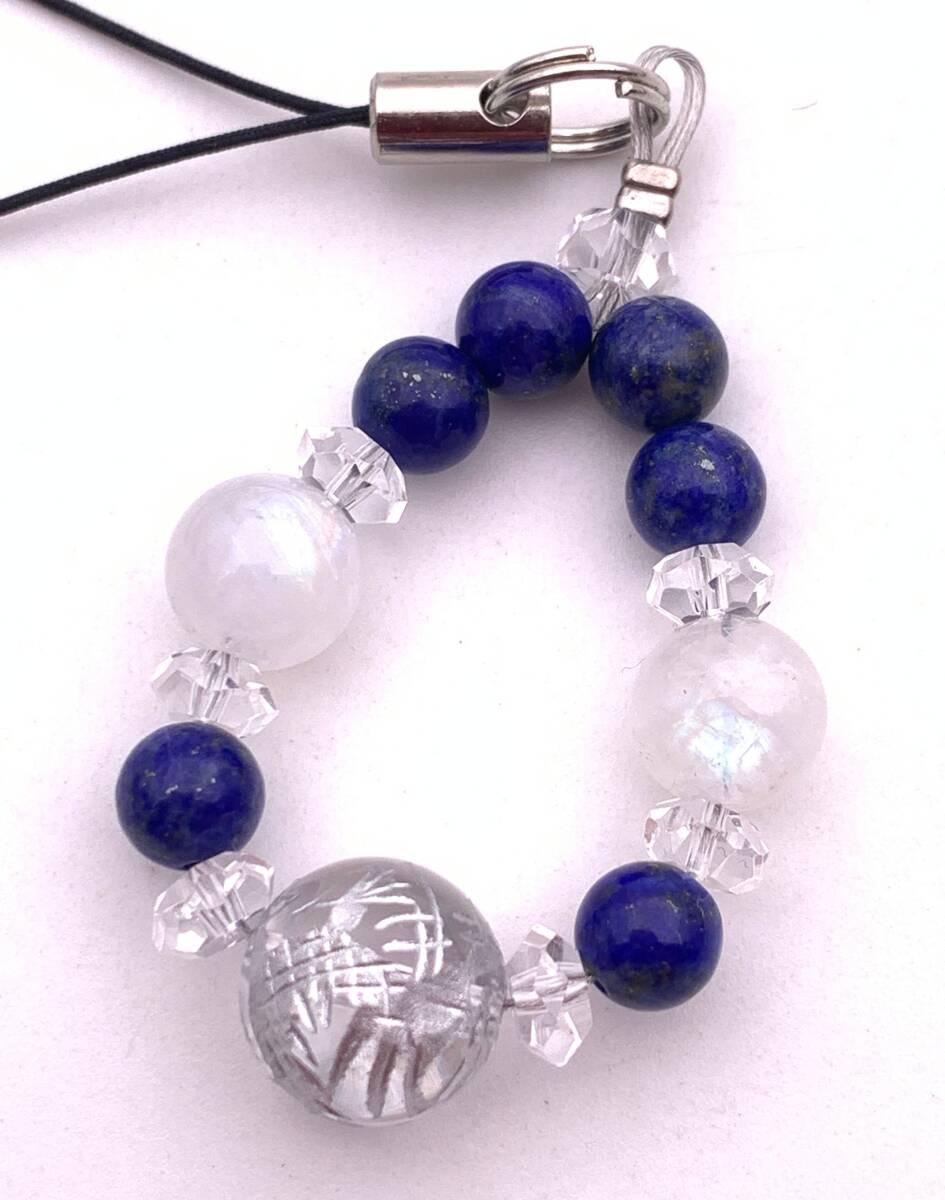 天然石水晶銀彫り青龍&ラピスラズリ&ムーンストーンのストラップ