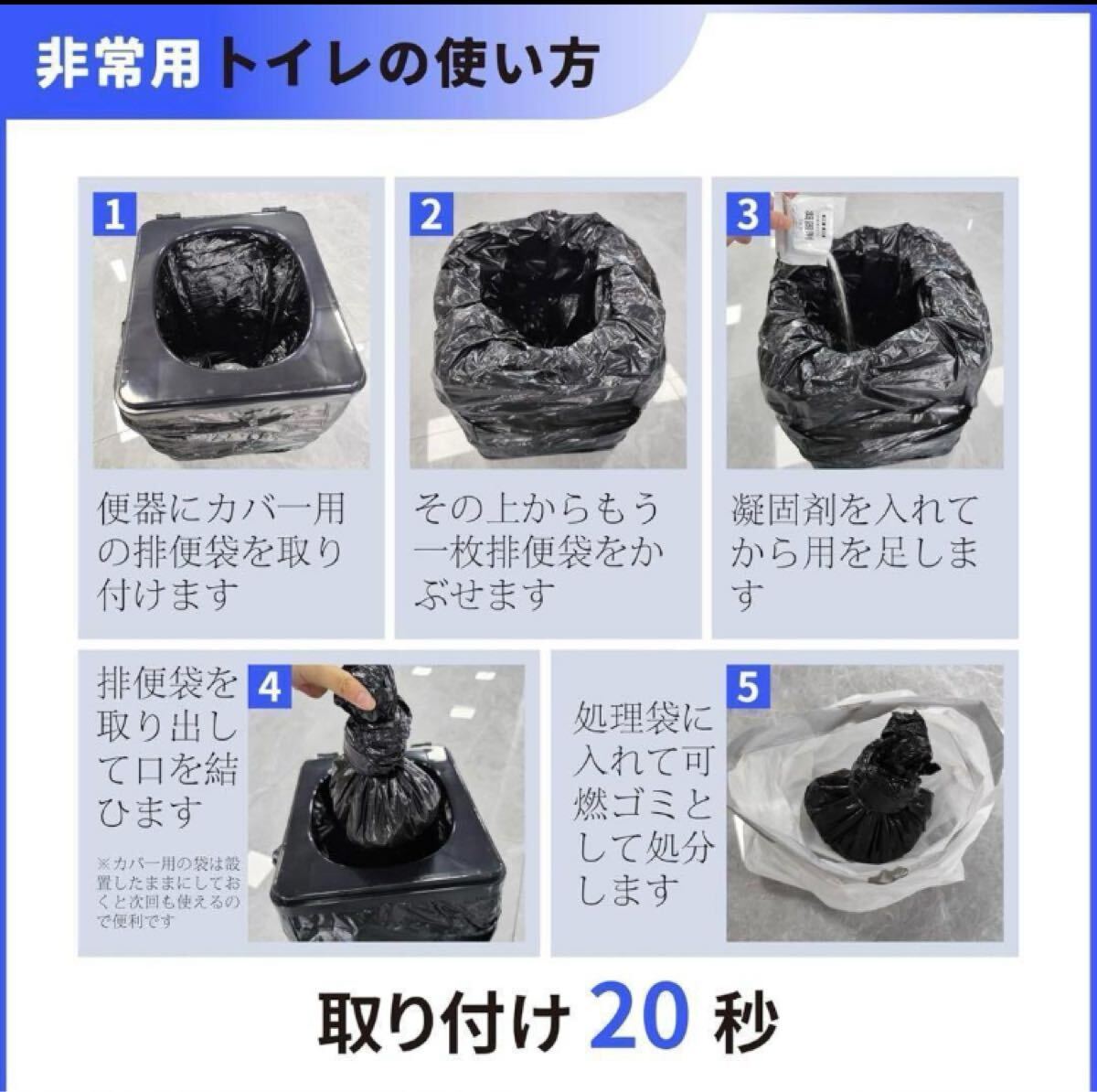 トイレに被せるだけの簡単取付なので、ストレスなく簡単にお使いいただけます。災害用トイレとしてだけでなく、携帯トイレとしてトイレにすぐにいけない場合にも活躍します。介護の際にもお使い頂けます。