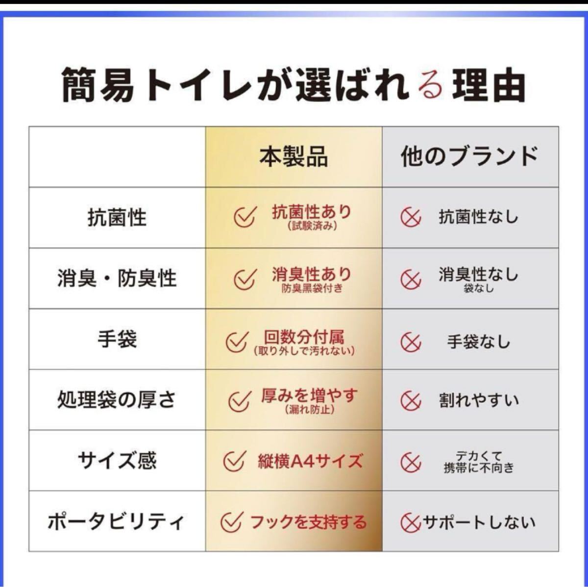 地震・大雨などの災害時に、水が流せずトイレに困るケースが多いです。簡単に取り付けられる簡易トイレのため、非常時でも安心。非常食などの防災グッズと一緒に備えておくのがおすすめです。