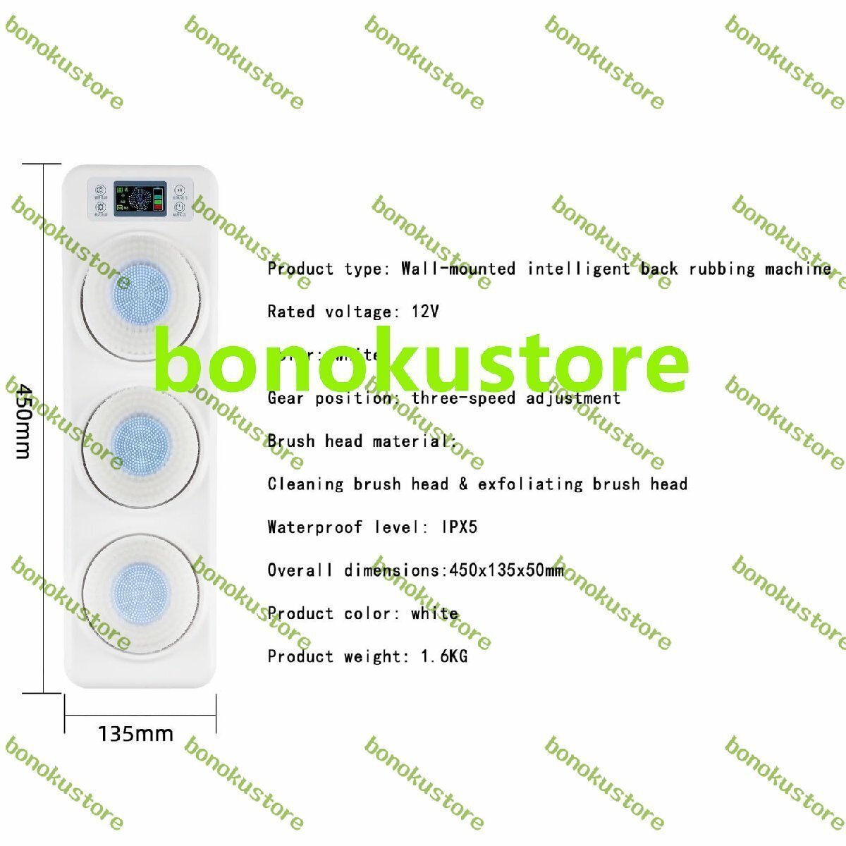 製品タイプ: 壁掛けバッククリーナー 定格電圧: 12V 色: ホワイト ギア位置: 3 速調整 ブラシヘッド素材: クリーニングブラシヘッド & 角質除去ブラシヘッド 防水レベル:IPX5 全体寸法:450x135x50mm 製品の色: ホワイト 製品重量: 1.6KG