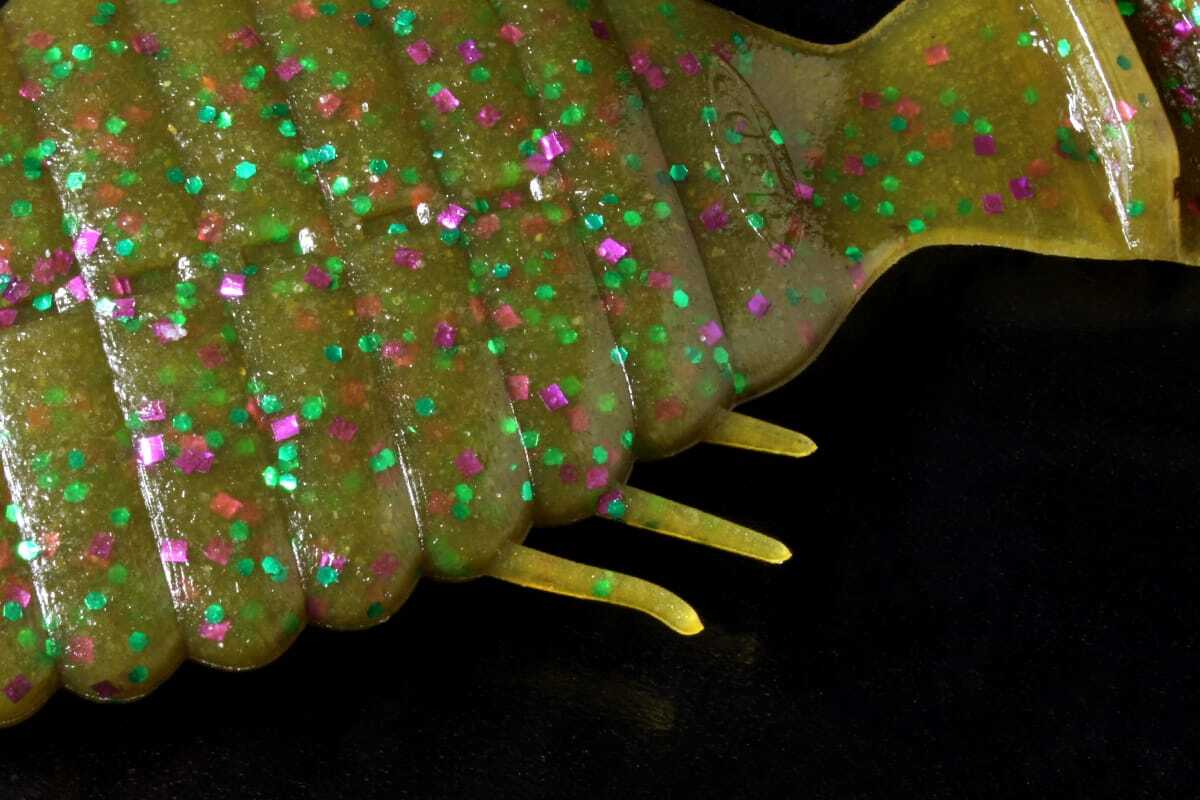 フィッシュイーターが好む甲殻類成分が配合され、引張強度が高められた針持ちの良い20%ソルト・ウルトラソフトマテリアルがワームの裂けや破損を軽減し、味と匂いで刺激します(2inchはソルト含有率10%)。