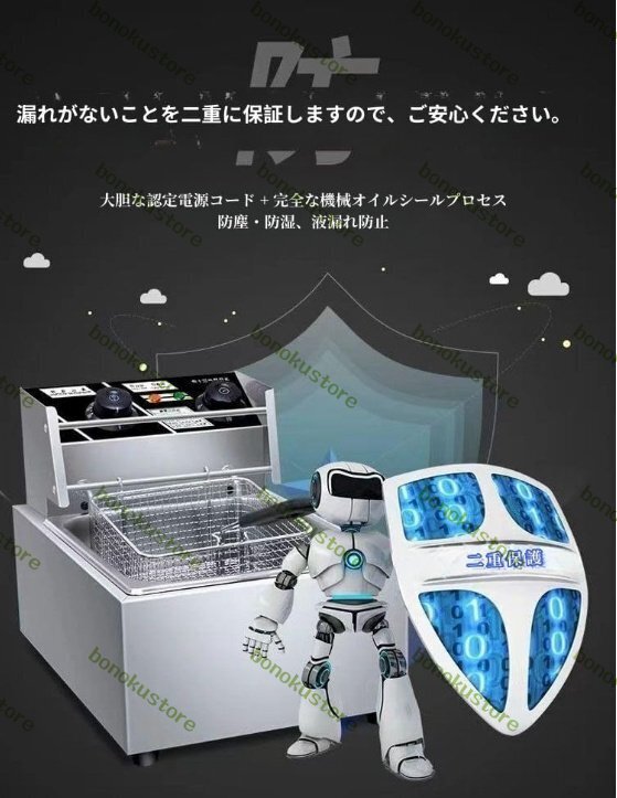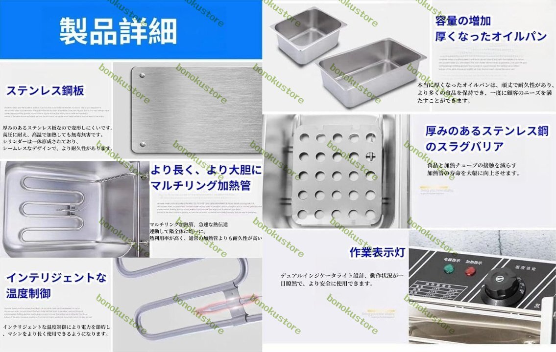 この商品について色 シルバー商品の寸法 42奥行き x 28幅 x 30高さ cmワット数 2500 W【温度調節】60℃~200℃まで温度設定できます。温度過剰防止装置が付き、油温が設定した温度以上に上昇する場合は自動的に電気の供給を止まる。(設定温度を超えると自動的に電源が切れま