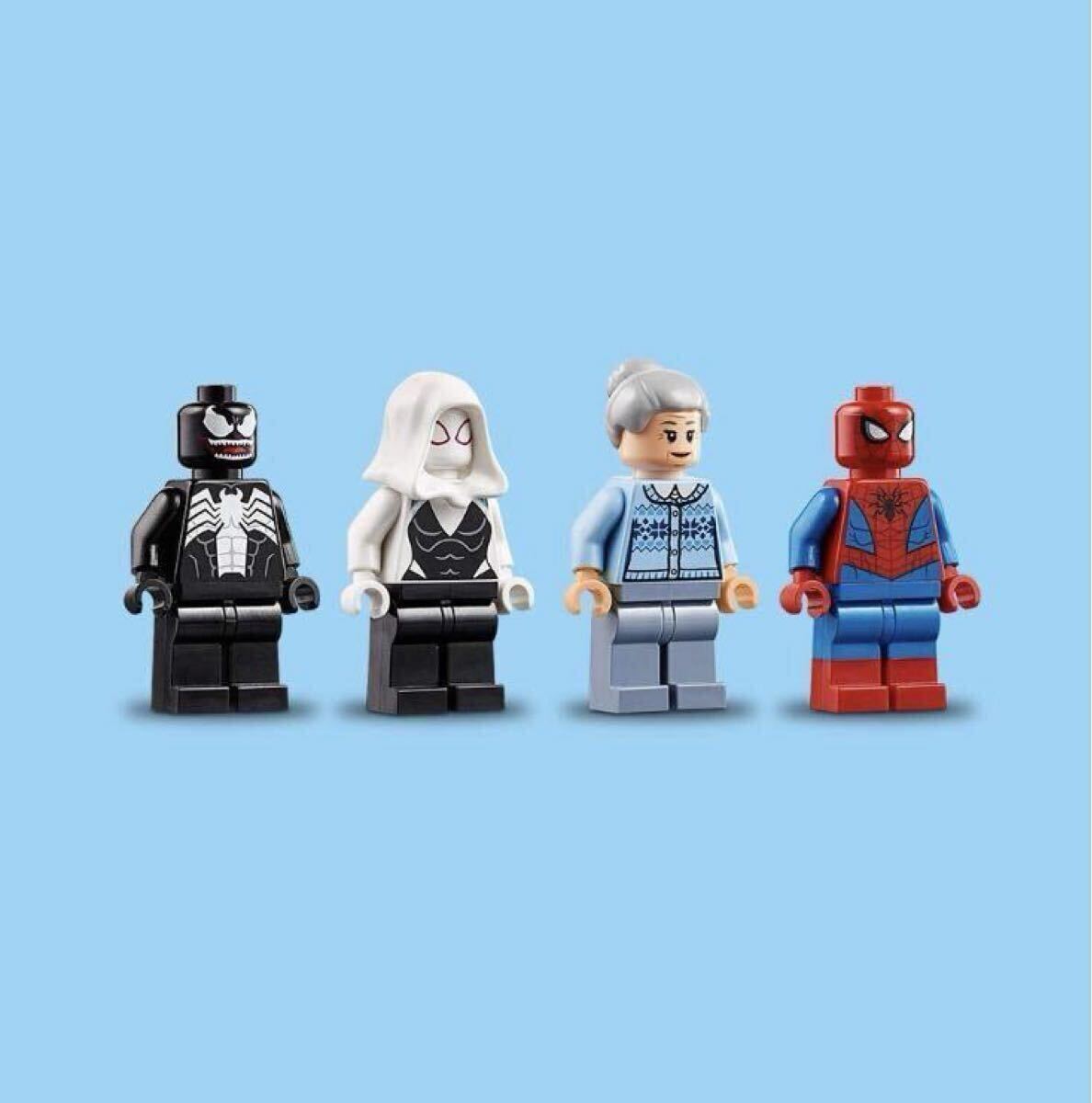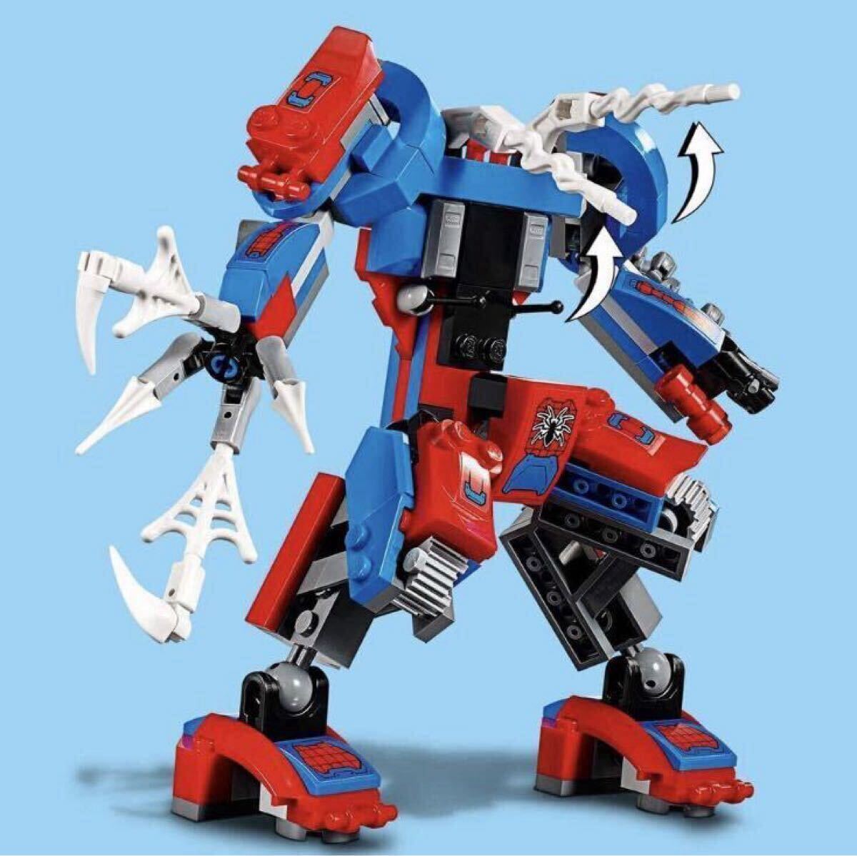 テクスパイダー/ウェブシューター、グリッピングクローを搭載したポーズ可能なスパイダーのメクモデル、ミニフィギュア4体(スパイダーマン、スタッドシューターを搭載したホーバーボード付きのゴーストスパイダー、ヴェノム、メイおばさん他、各種のウェブエレメント。