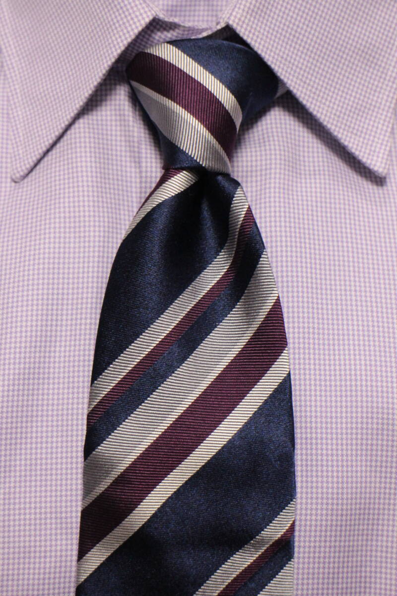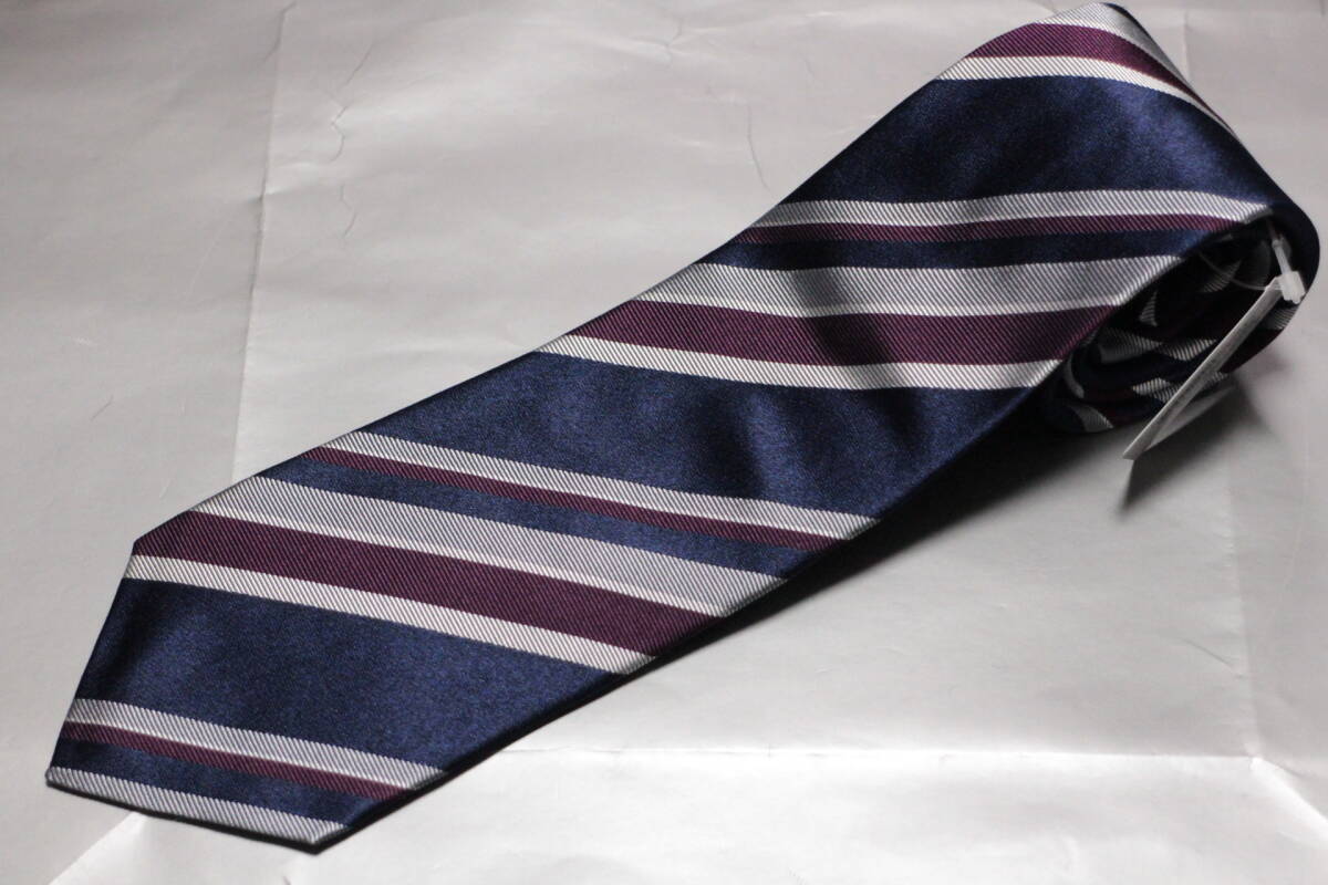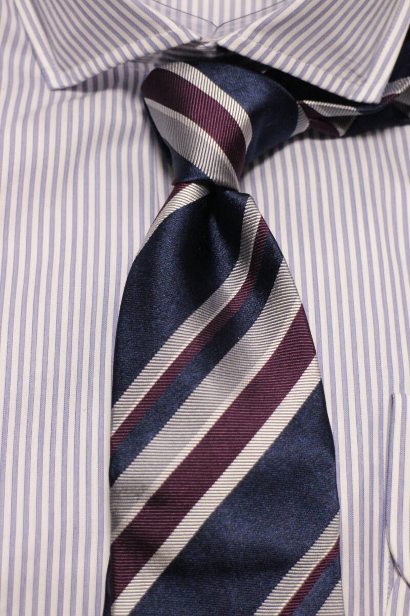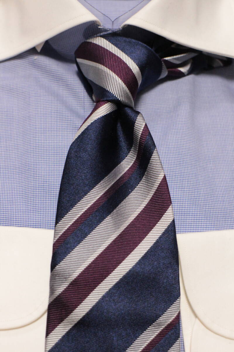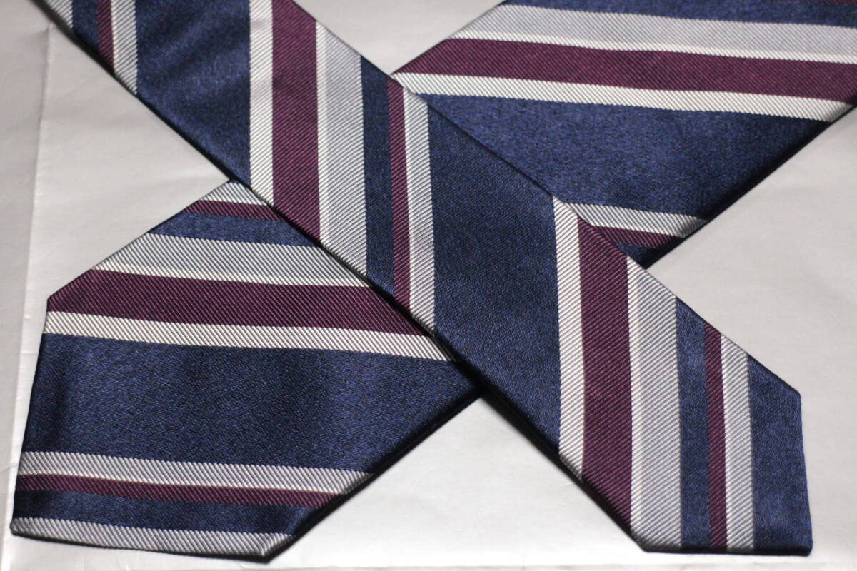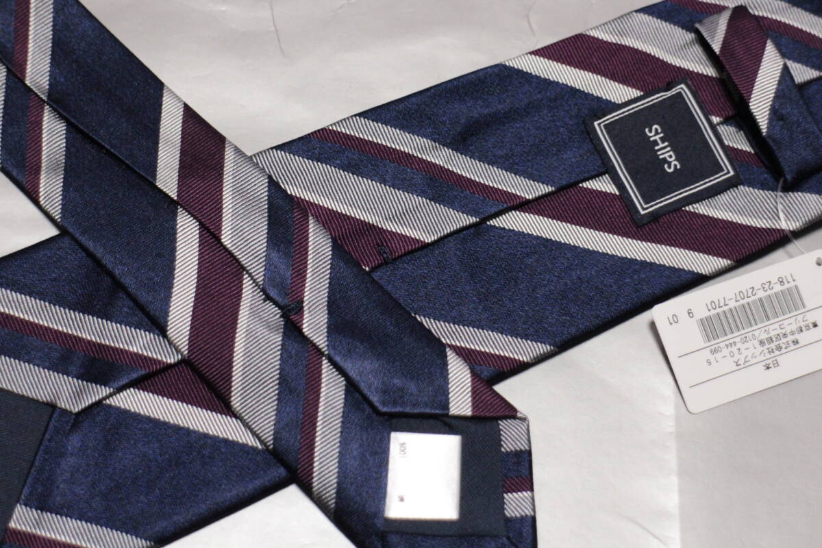 シップス新品ネクタイ超華麗ネイビー*グレー*パープル*シルバーレジメンタル極上サテンツイル織切返しマルチストライプハンドメイド