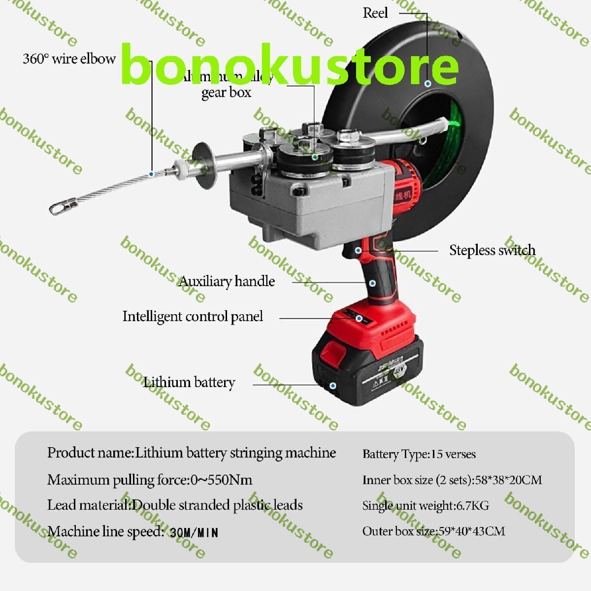 商品説明 商品の説明 名前: リチウム電池ストリングマシン 引張力:0~550Nm サイズ: 58x38x20CM リード材質: 二本撚りプラスチックリード マシンライン速度: 30m/分 チェックリスト: 1x リチウム電池ストリングマシン 2x4500mAh リチウム電池 1x20mリード 1x 充電器 ワイヤ