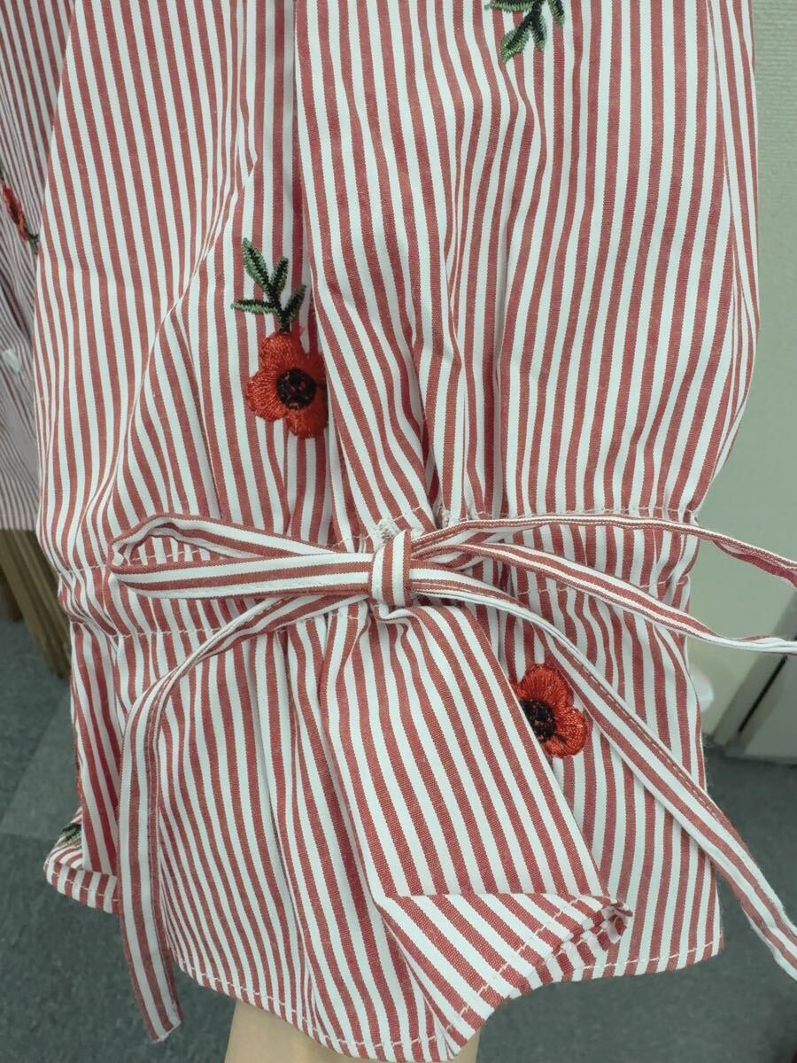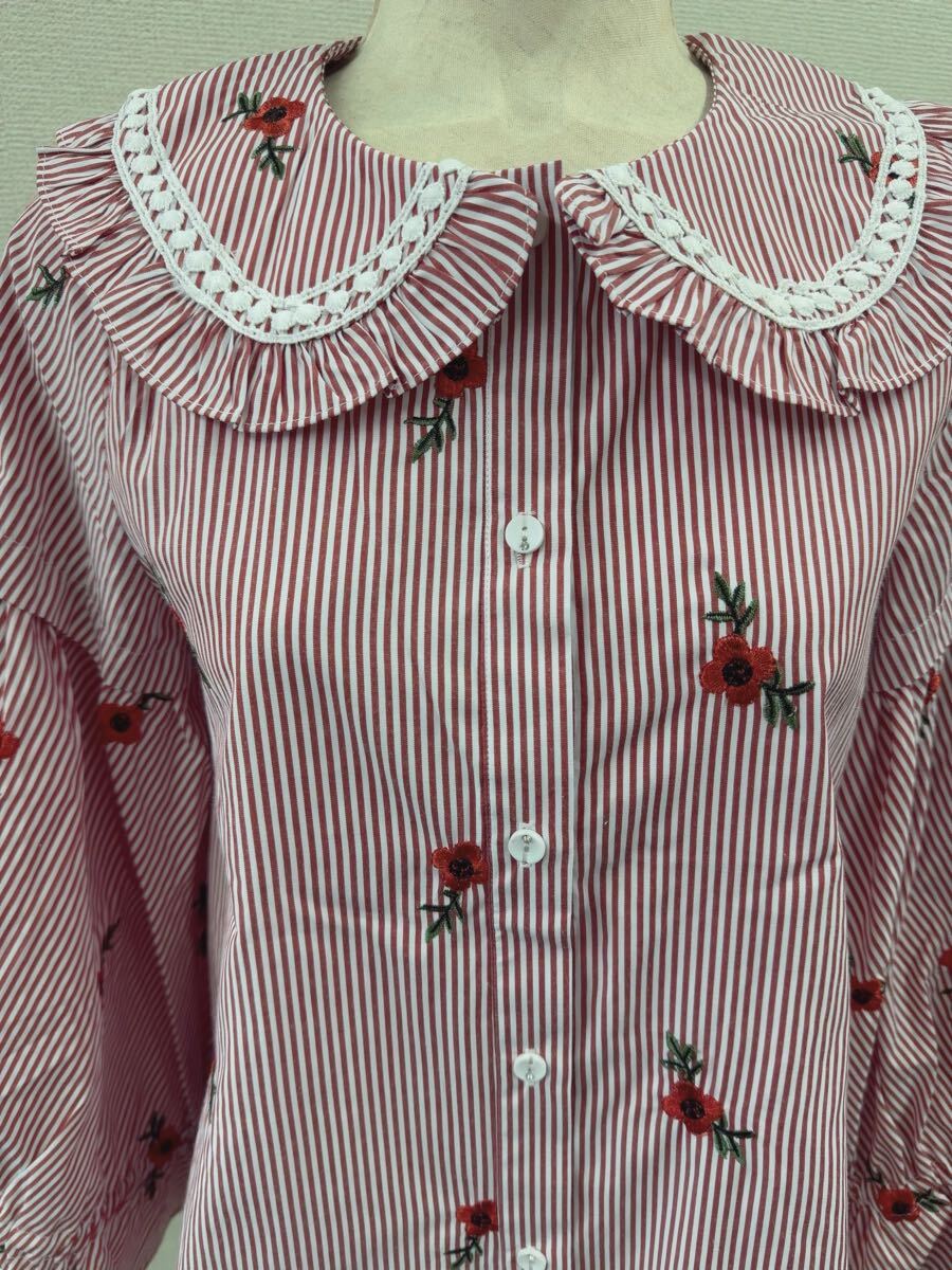 赤と白のストライプに花柄刺繍、レース襟のフリル袖シャツ。