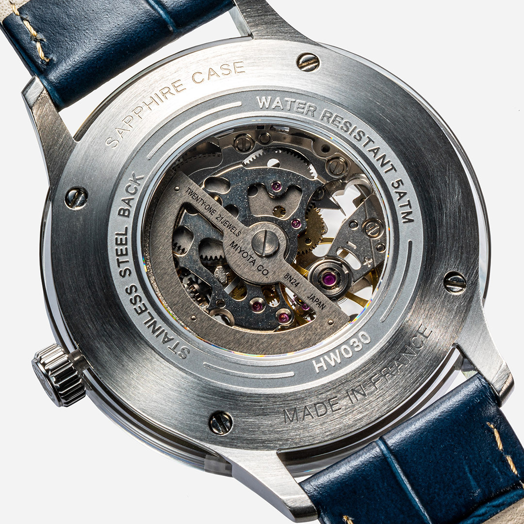 ①高精度な日本製の自動巻き高級ムーブメントを搭載した、フランス製