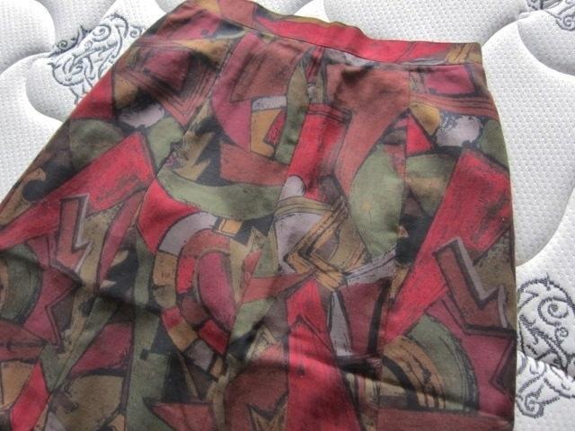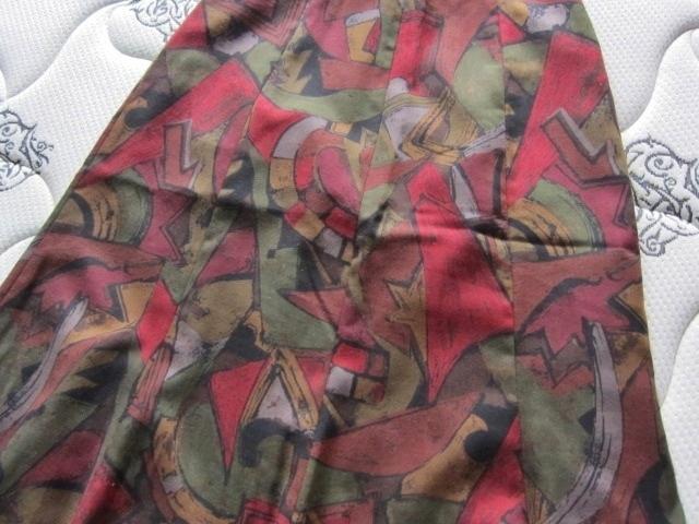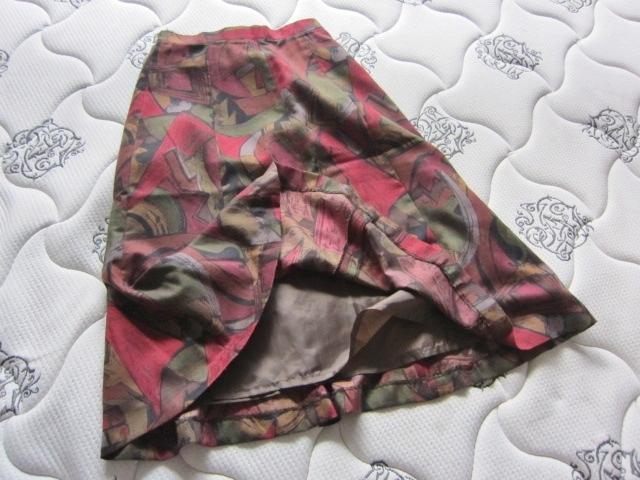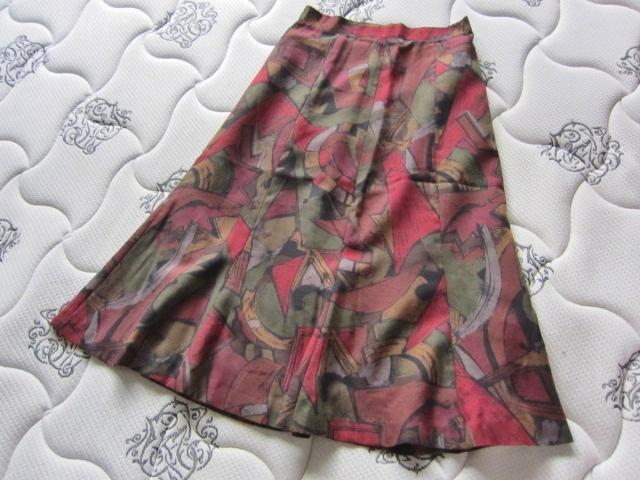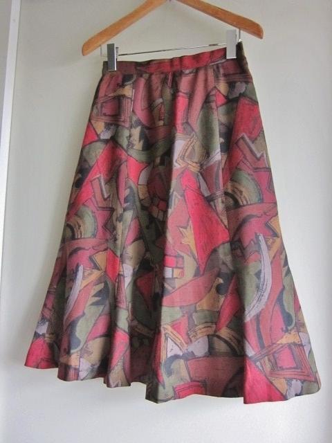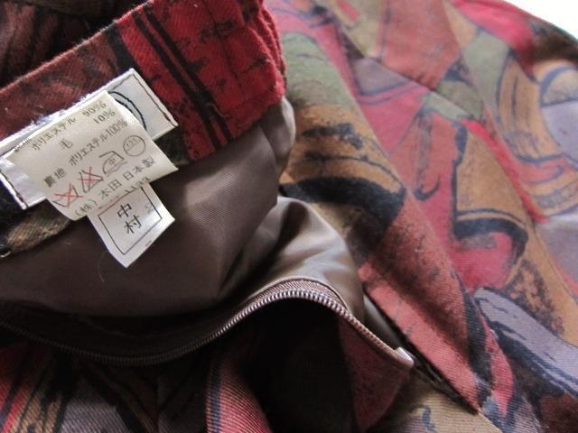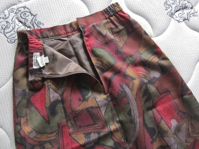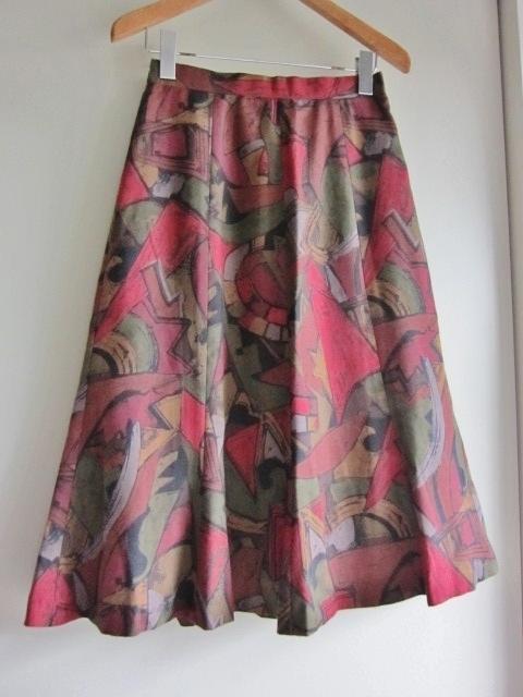 上質な質感で肌触りよい素材が使用され華やかで落ち着いた色合い  アートのような立体感あるデザイン性があるスタイリッシュでお洒落なスカート。裏地あり  良き時代の品は良いものが使用されていましたので長くこれからもご愛用頂けます。(80年代のブランド、ヴィンテージの品です)