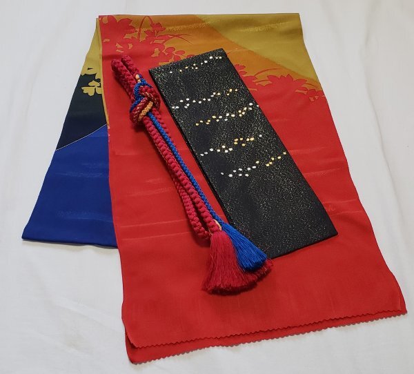 帯揚げは丹後ちりめん 赤・黒・青・マルチカラー系です。