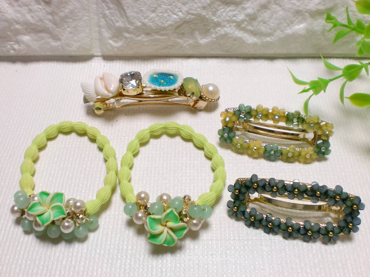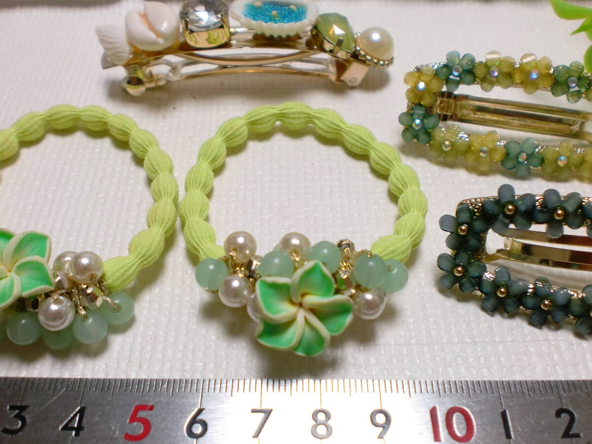 Ltグリーンが可愛いヘアゴムはプルメリアが付いたトロピカルなデザインです^^