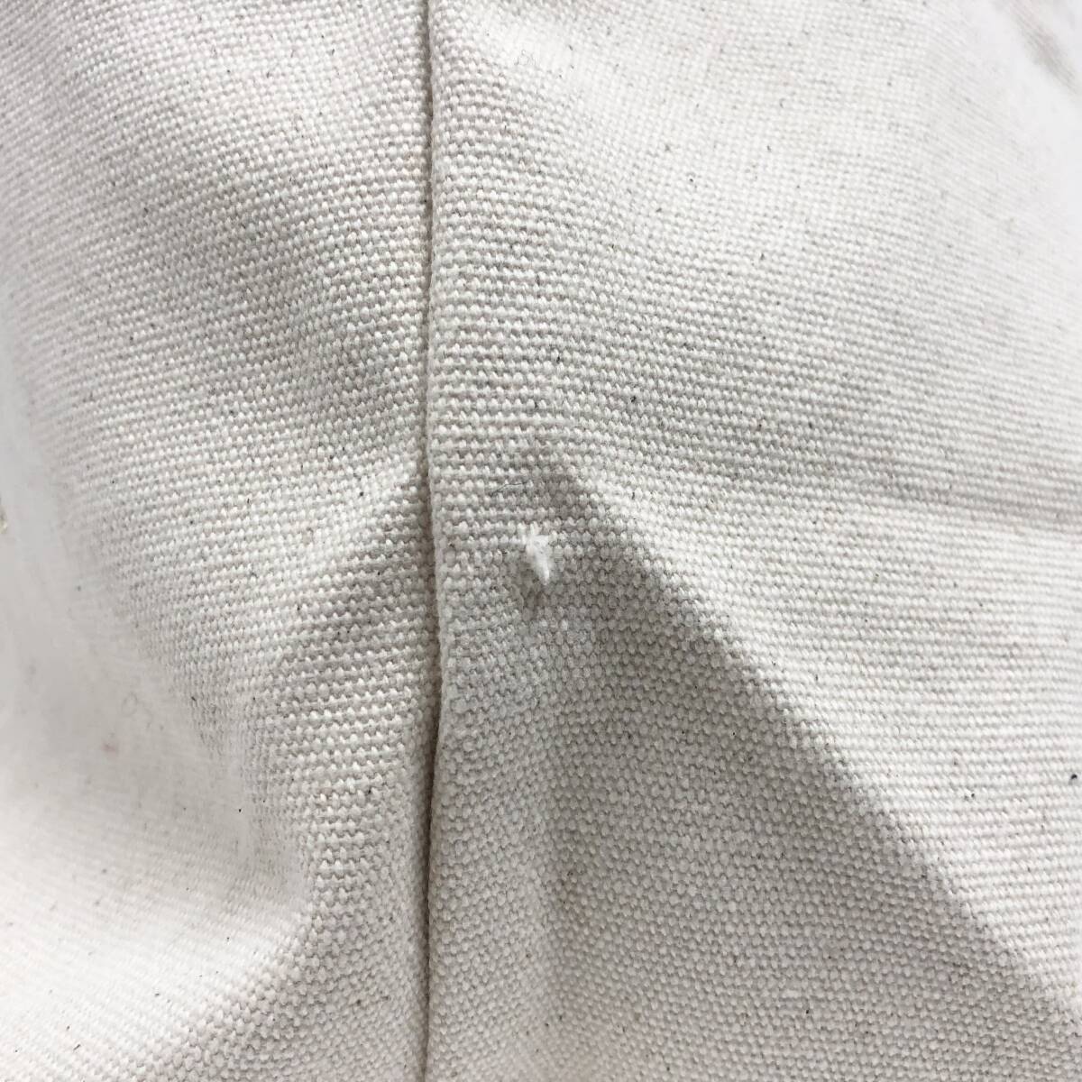 前面右側持ち手付け根部分に汚れがあり、左側側面に糸解れがあります。