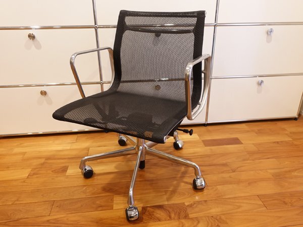 ご覧いただきましてありがとうございます。 チャールズ&レイイームズ[Charles&Ray Eames]やジョージネルソン[George Nelson]、イサムノグチ[Isamu Noguchi]などそうそうたる顔ぶれのプロダクトを取り扱う米国はハーマンミラー社。 こちらはチャールズ&レイイームズによる名作「アルミナムグループマネジメントチェア」です。 リプロダクト品も多数存在していますが、ハーマンミラー社の正規品です。 貼り地はシグナス(メッシュ)。アームやフレームはアルミバフ仕上げの人気の組み合わせです。 座面の昇降がガス圧式の、現行最新モデルです。 https://hermanmiller.co.jp/products/eames-aluminium-management-group-chair 張り地のメッシュ素材は弾性が高く、着座時に適度な反発力もあり、同社の「アーロンチェア」のような、フワフワと宙に浮くような着座感を得ることができます。 コンディションですが、中古の状態で入手したものですが、全体的に良好です。 法人オフィスにて、主に会議用途で使用されていた個体でしたので、個人による日常使用や長期使用はなく、背座メッシュのへたりもほとんどない様子です。 背のトップ、座面の先端にわずかなスレなどはございますが、破れはございません。 このイスの宿命ともいえる、アームレスト先端のキズが目立ちます。テーブルとの接触で、日々キズがついてしまうものです。 中古品によくある、フレームの「腐食」はあまり出ておらず、ピカピカとした光沢感を維持しており、全体的にきれいな印象です。浅いスリキズや、若干の金属のくもりなどはございます。 中古品ですと、パーツの欠品、欠損の多いチェアですが、すべてのパーツが揃った完品です。 アームレストのキズは目立ちますが、全体的にコンディションのよい個体です。 この機会にいかがでしょうか。 |