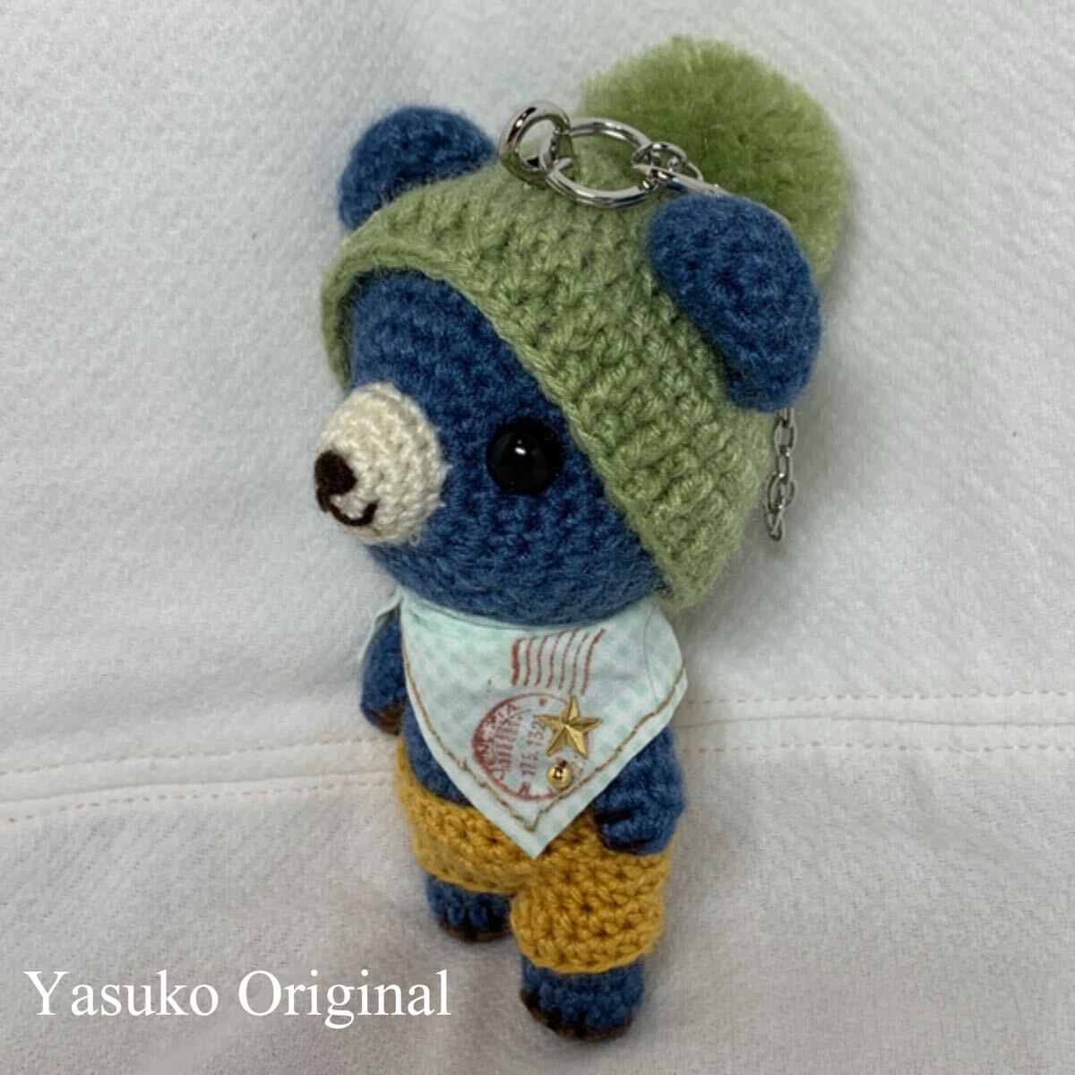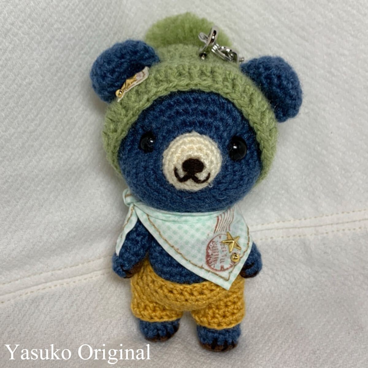 濃い青のクマのアミグルミのバッグチャームです。