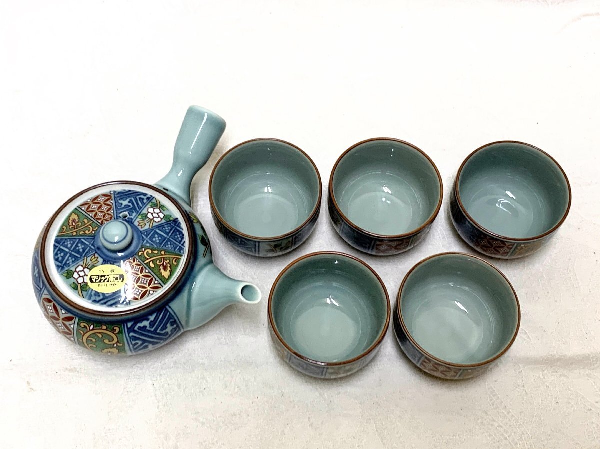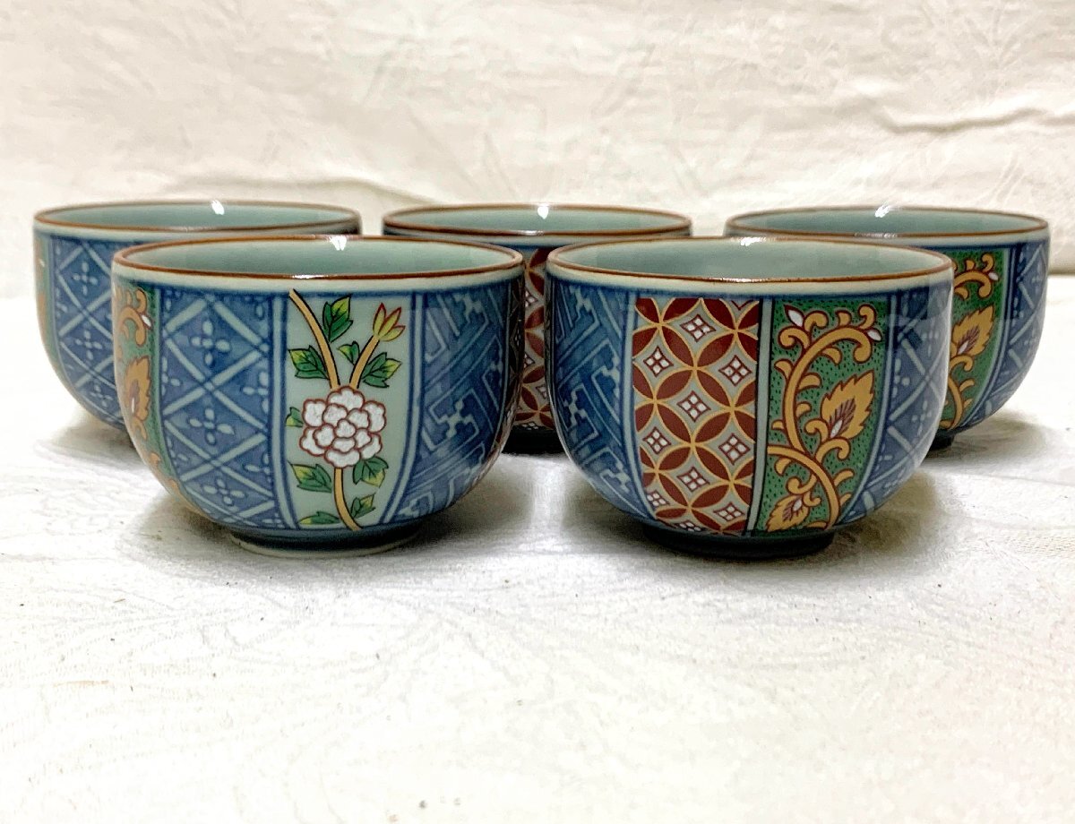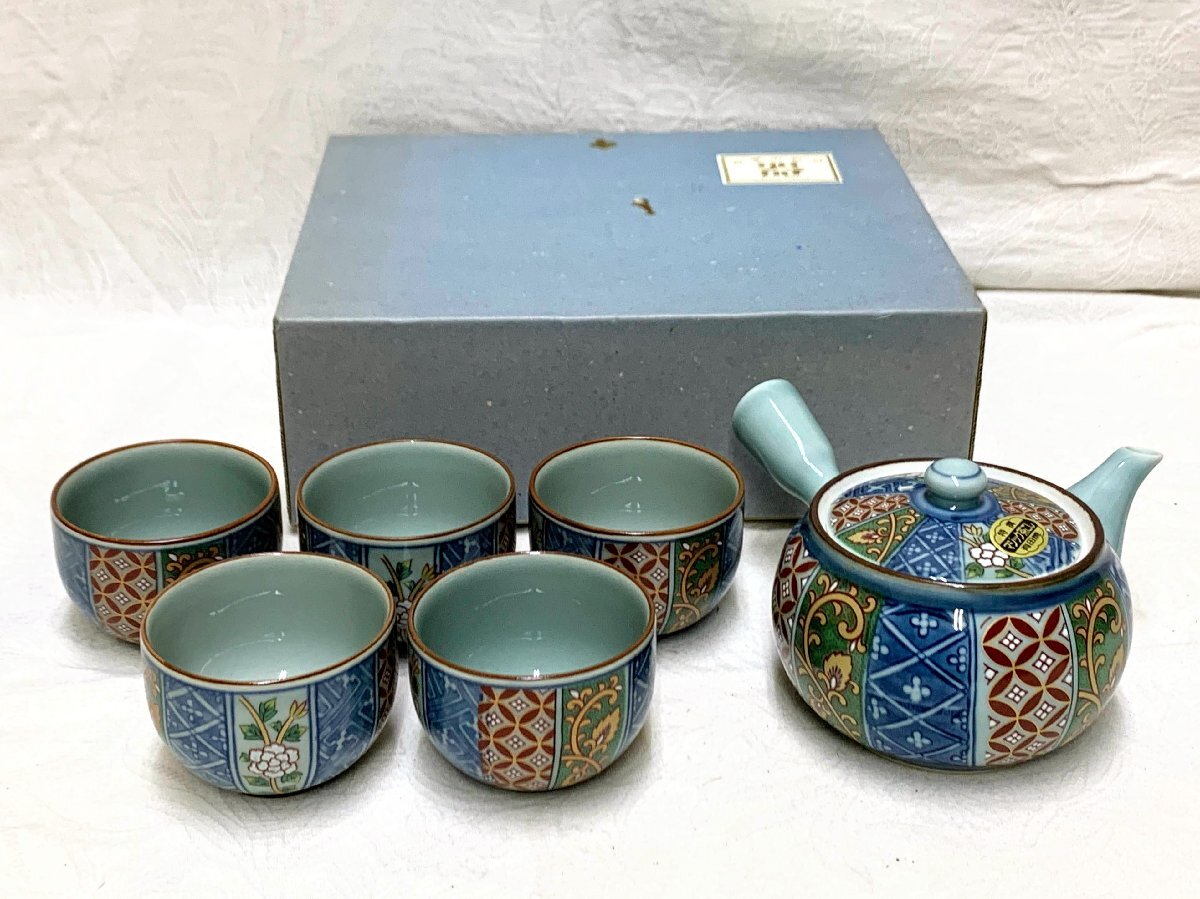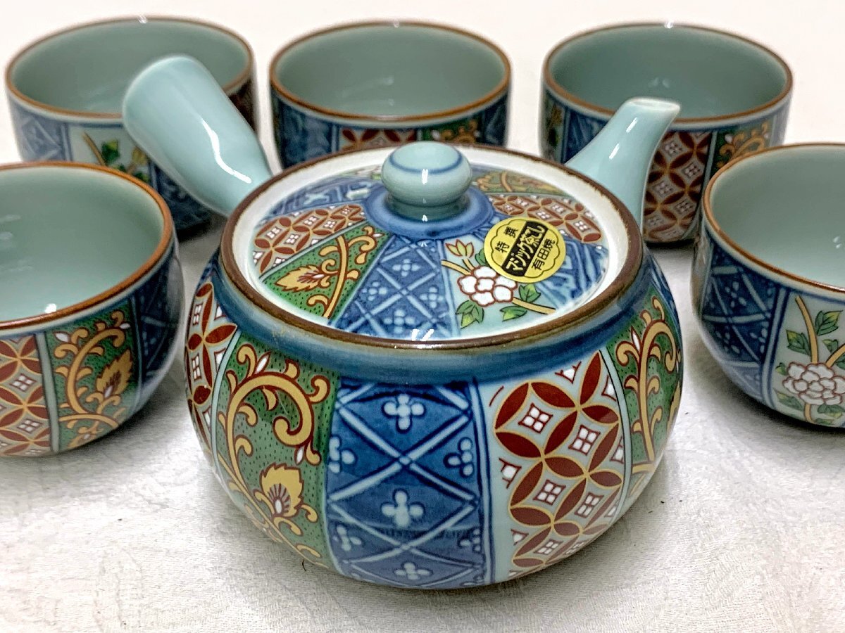 16955/四季の彩り 器 有田焼 茶器揃 急須 湯呑5客 西雲 染錦割花 マジック茶漉し 未使用 紙箱 茶器 煎茶器 茶道具