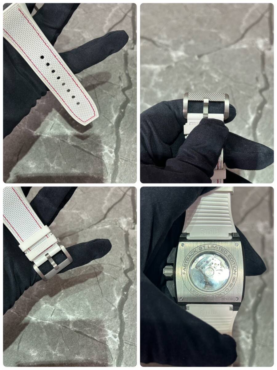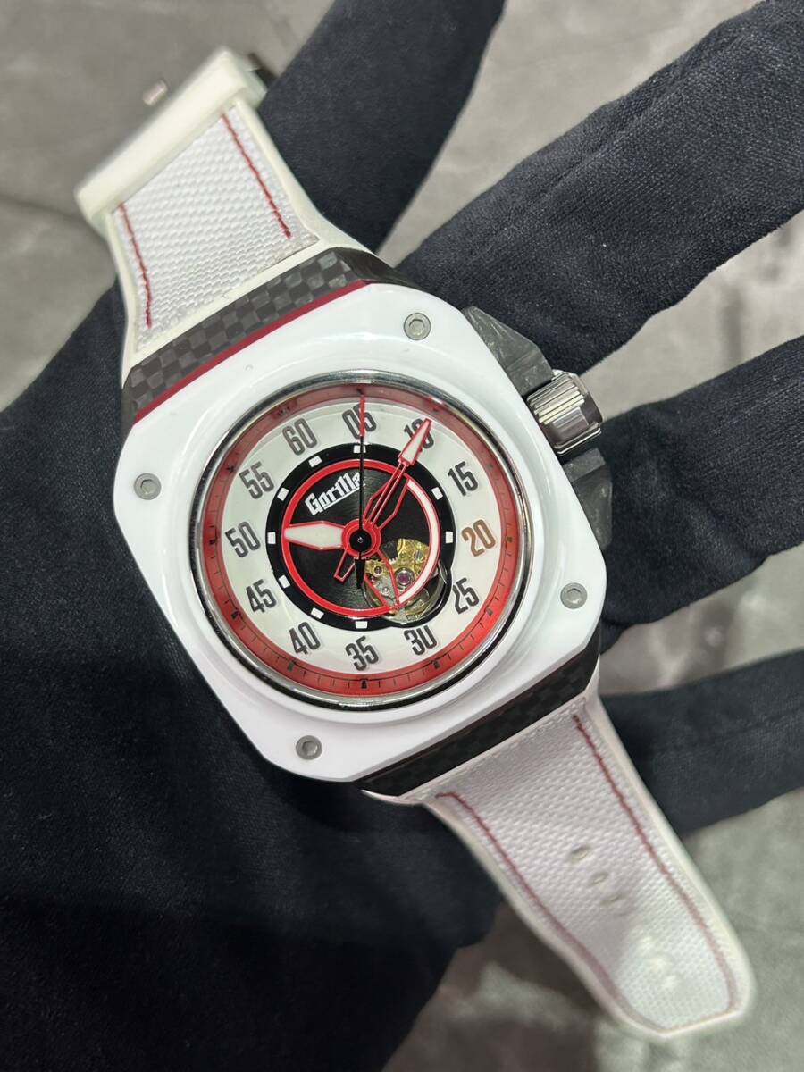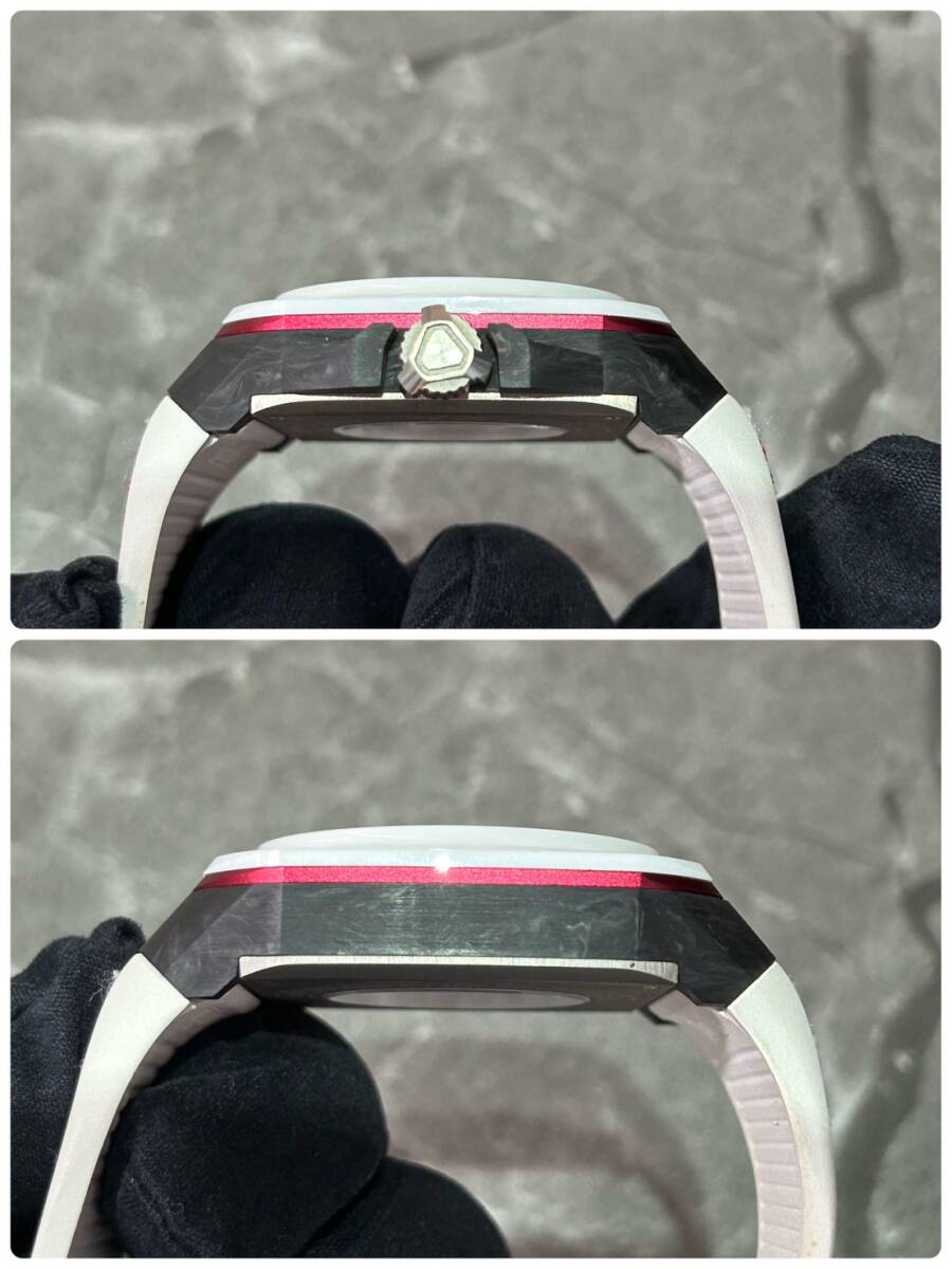 日本の国旗をイメージしたような白/赤の配色となっており、ケースサイドはカーボン、アルミが使用されベゼルはセラミック、ケース裏はチタンと様々な素材が組み合わされたケースとなっております。