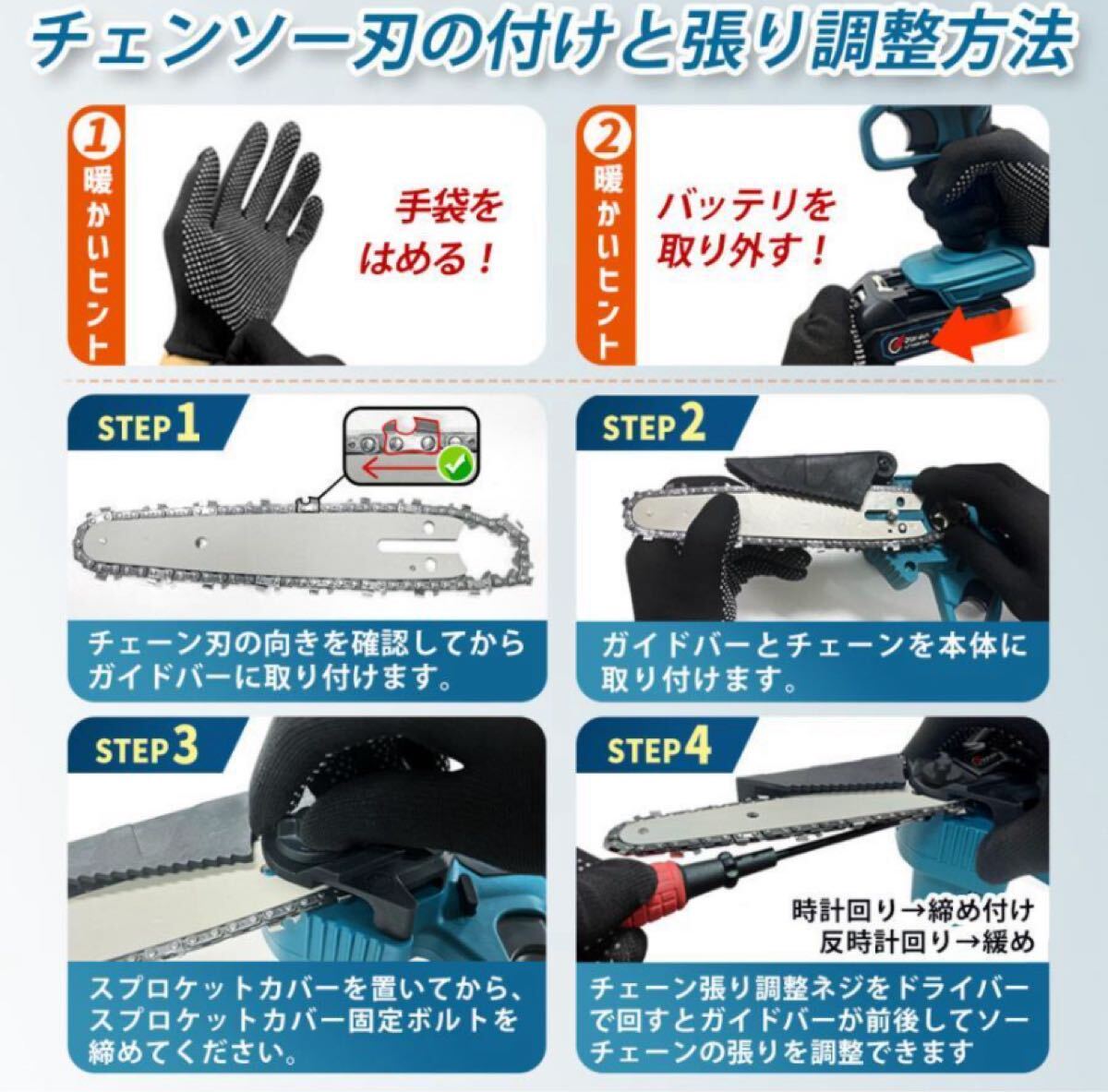 付属品:チェーンソー本体*1、バッテリー*1、充電器1*、収納箱*1、チェーン*1、ドライバ*1、ゴーグル*1、手袋*1、オイルボトル*1