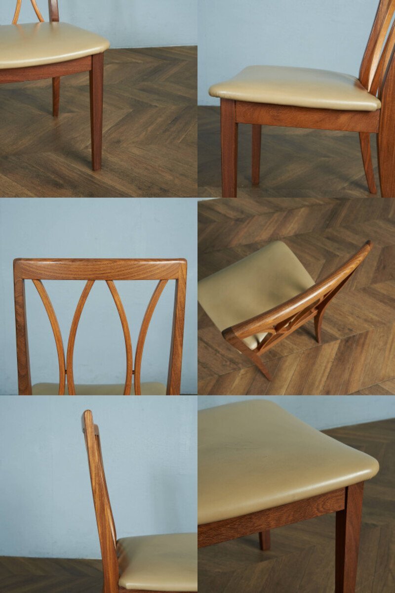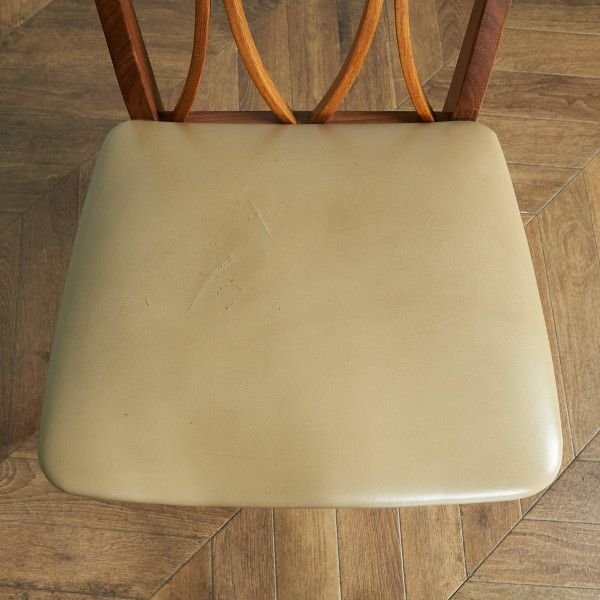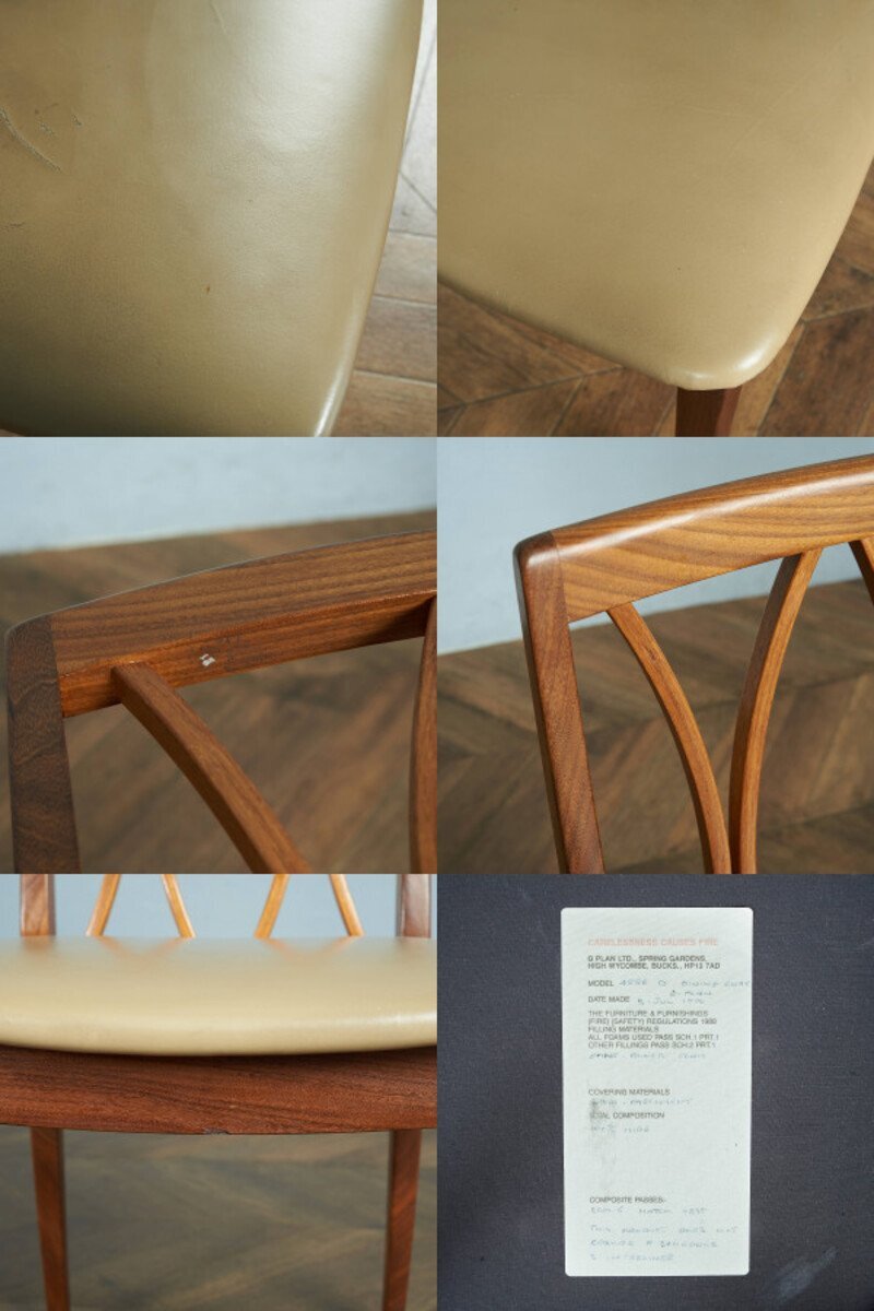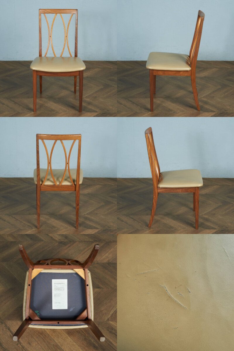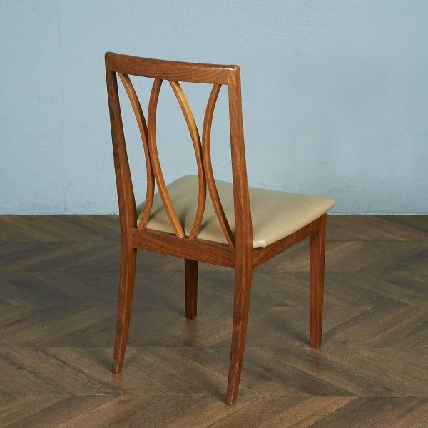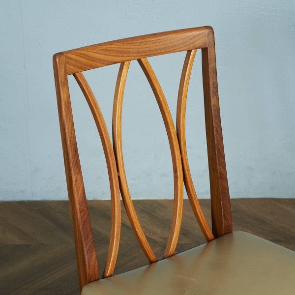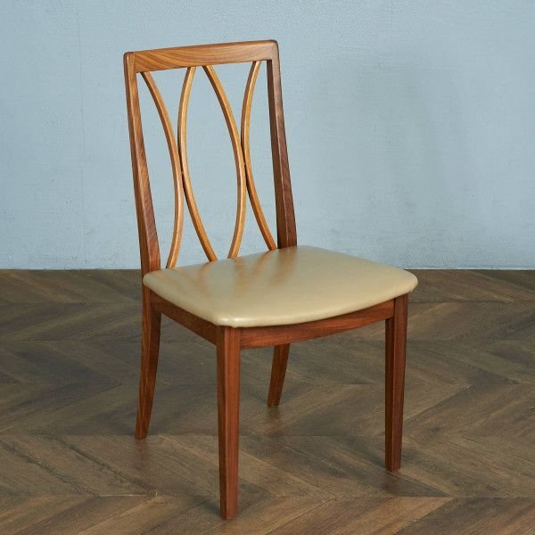 イギリスにおいてミッドセンチュリーを代表するブランド G-PLAN(ジープラン) による、Victor Bramwell Wilkins(ビクター・ブラムウェル・ウィルキンス ) デザイン、Fresco(フレスコ) エックスバックダイニングチェア(カーブバックチェア4556D) です。 プライウッドを使用した背もたれの装飾が特徴のカーブバックチェア。アルファベットのXが並んでいるように見えることからXバックチェアとも呼ばれています。北欧ヴィンテージをルーツにクラシックのエッセンスが加わったシンプルながらも凛とした佇まいが絵になる美しい椅子です。 約50年前に英国で一世を風靡したG-PLANの中でも最も売れたシリーズと言われている「フレスコシリーズ」1960年のDanishシリーズに続き発表当初のデザインは Ib Kofod-Larsenが手がけチーク材を用いた北欧色の強いデザインとなっています。現代においてもGプランを象徴する最も人気の高いシリーズです。 |