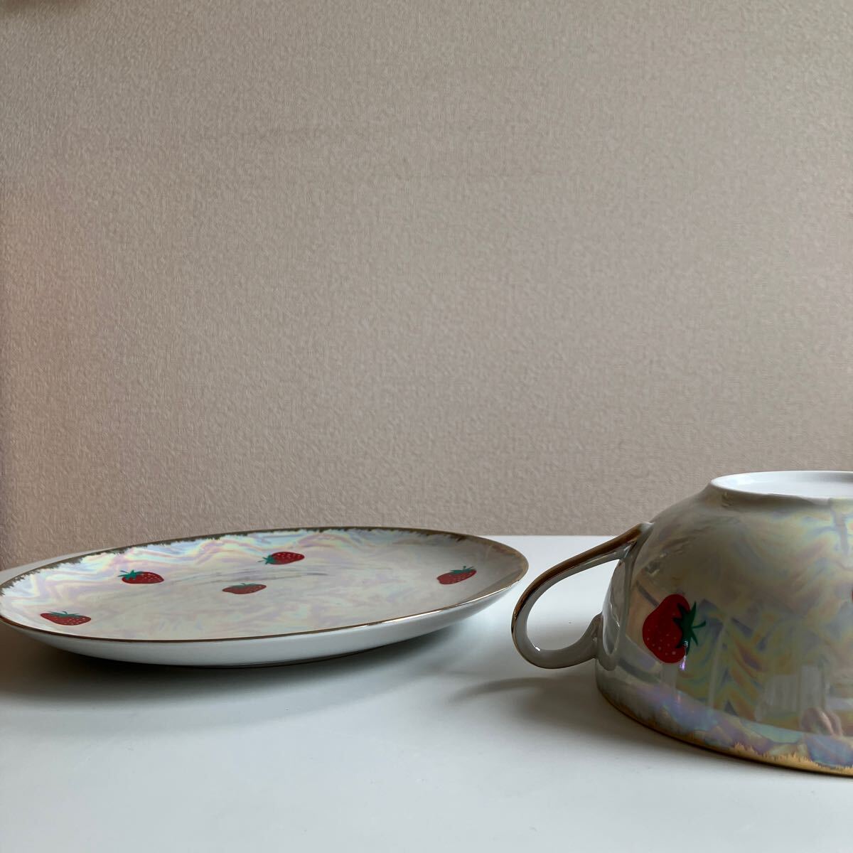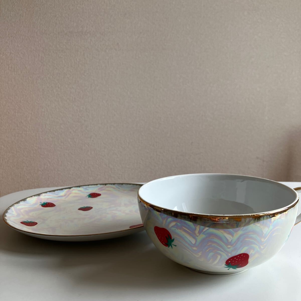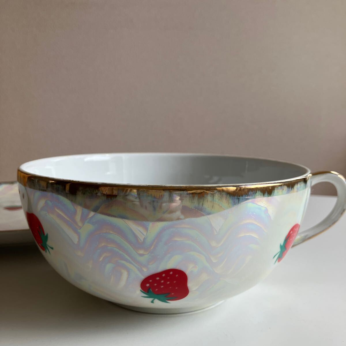 いちご柄 ボール 大き目皿 セット ビックカップ&ソーサー 苺柄 ストロベリーパーム 昭和レトロ アンティーク かわいいいちご 陶器 /金彩