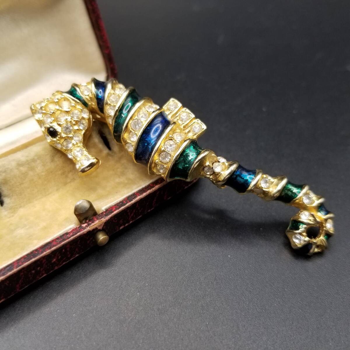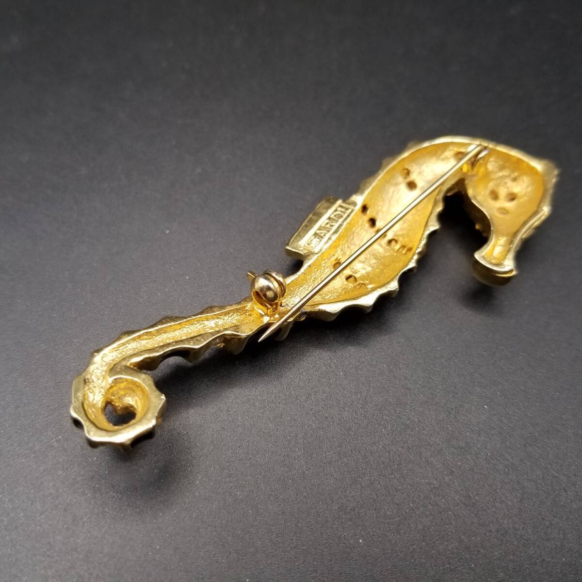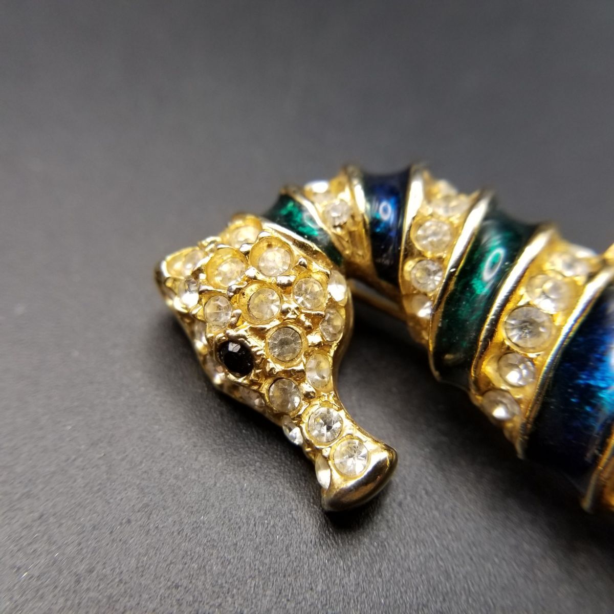 80's頃 SARDI 英国 ヴィンテージ 緑のタツノオトシゴ ブローチ 海の生き物モチーフ ラインストーン装飾 大ぶり エレガント コスチュームジュエリー Y23-F