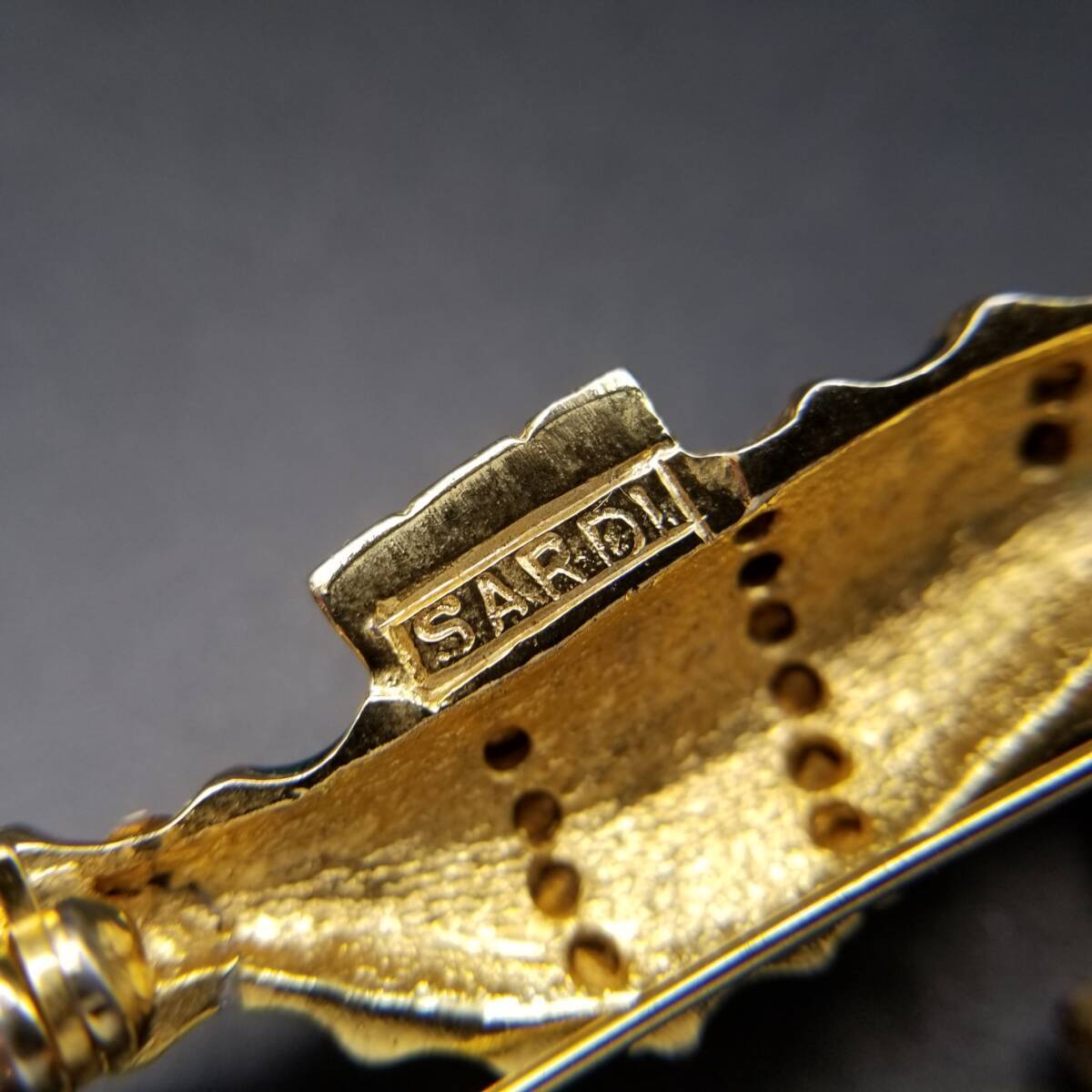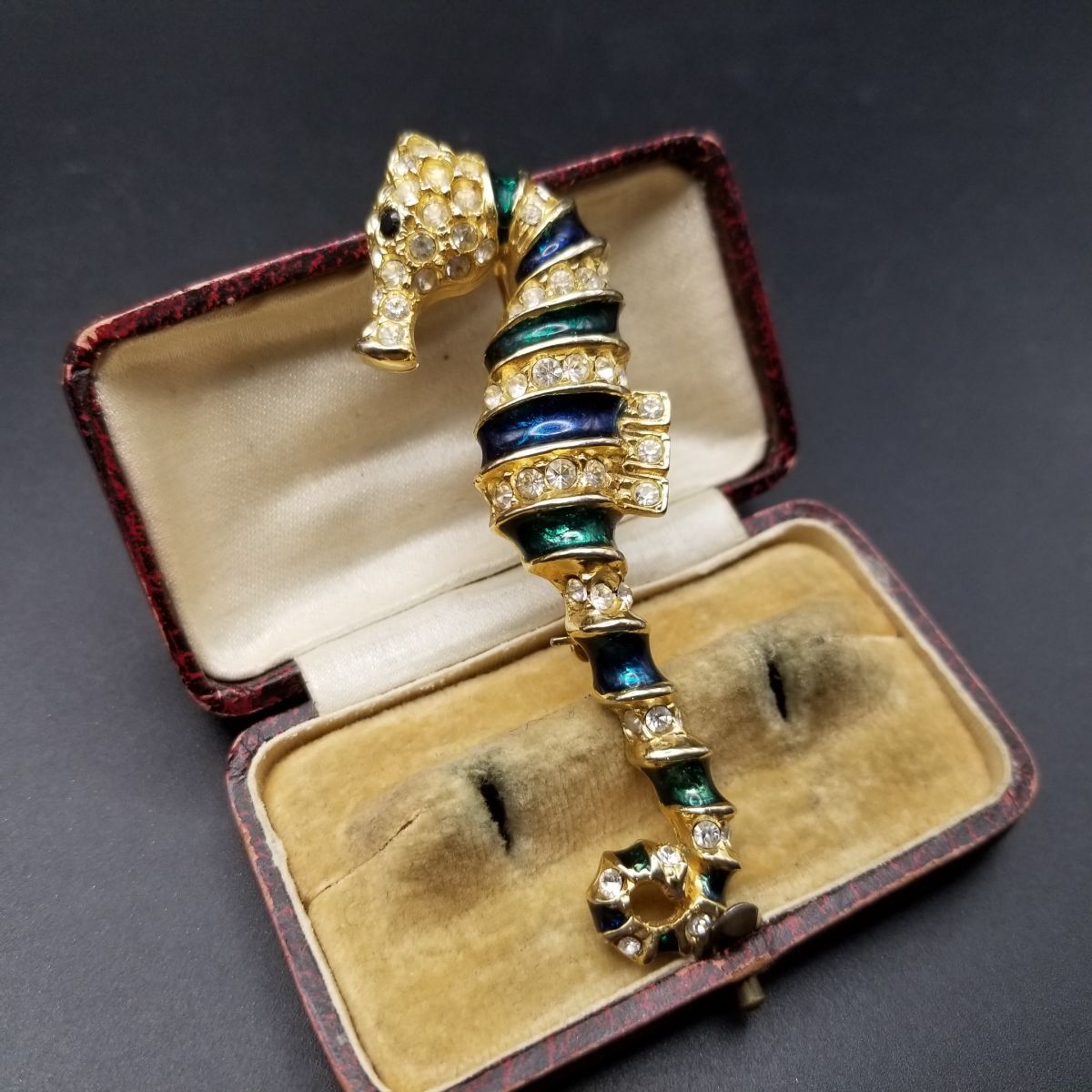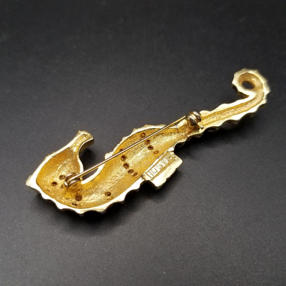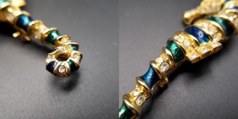 80's頃 SARDI 英国 ヴィンテージ 緑のタツノオトシゴ ブローチ 海の生き物モチーフ ラインストーン装飾 大ぶり エレガント コスチュームジュエリー Y23-F