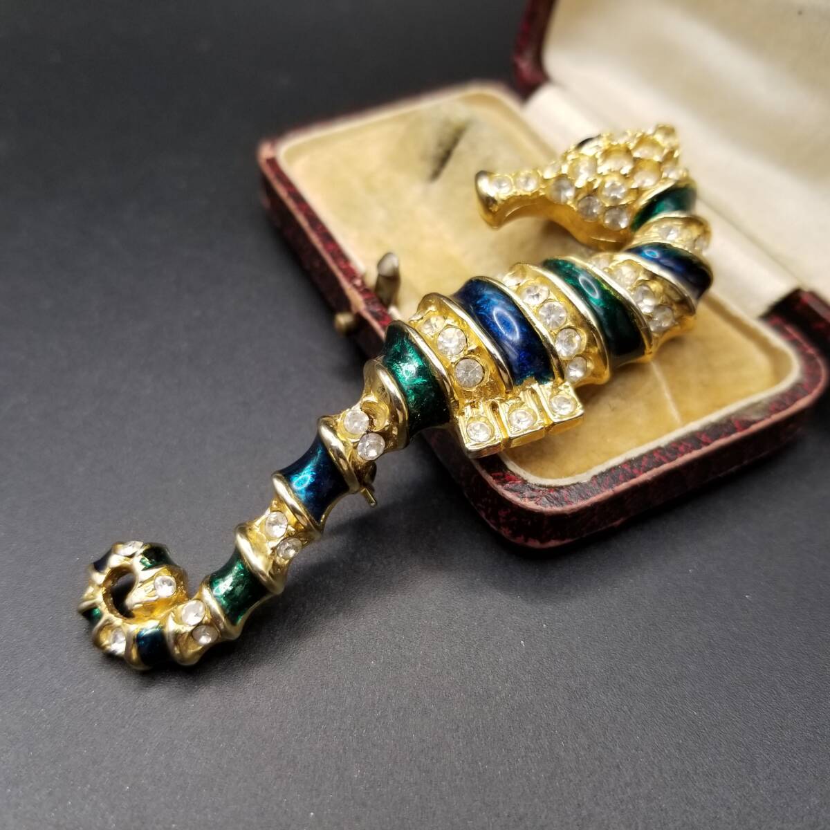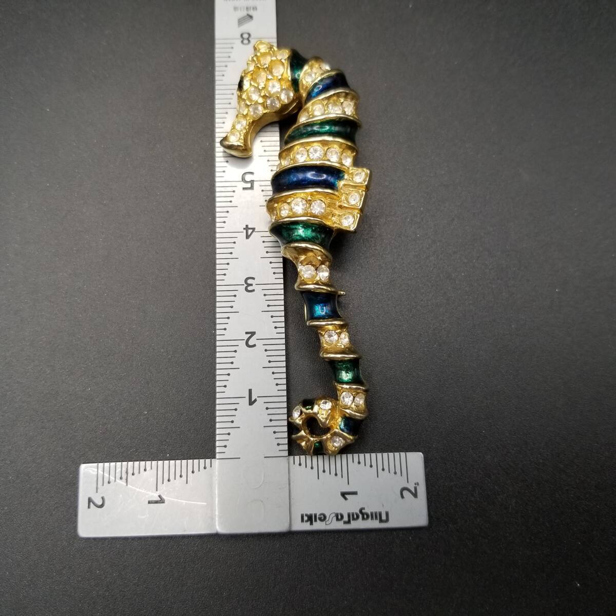 80's頃 SARDI 英国 ヴィンテージ 緑のタツノオトシゴ ブローチ 海の生き物モチーフ ラインストーン装飾 大ぶり エレガント Y23-F