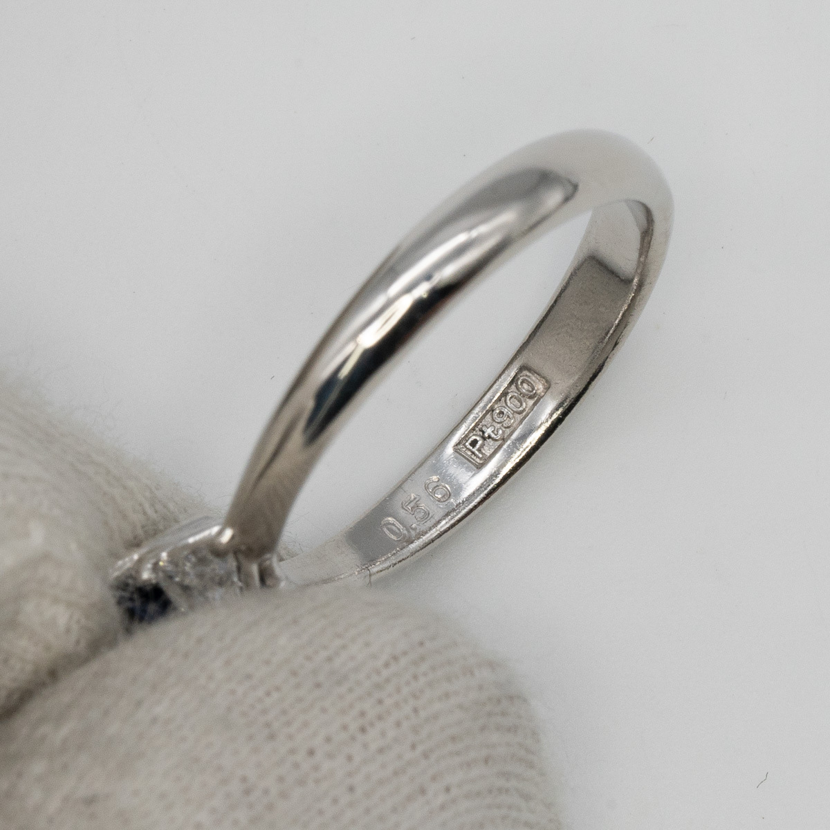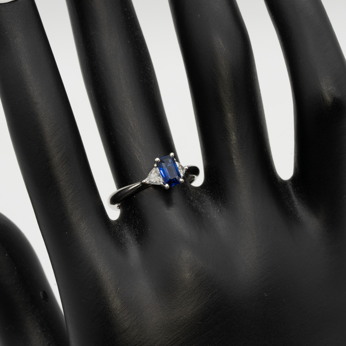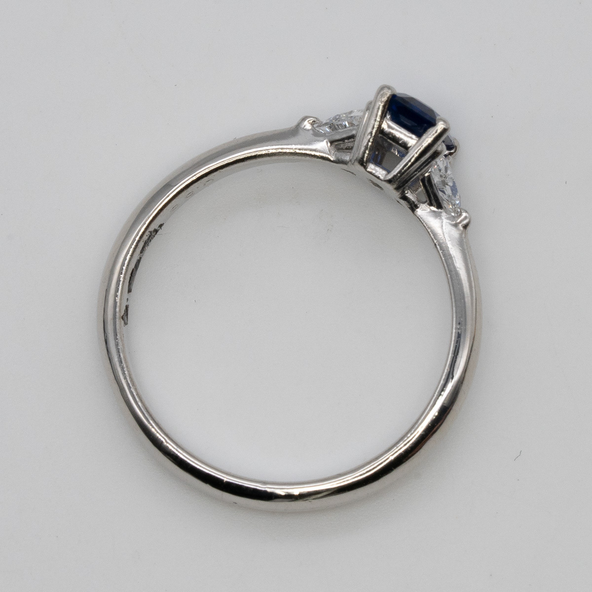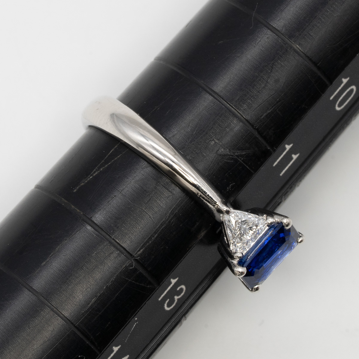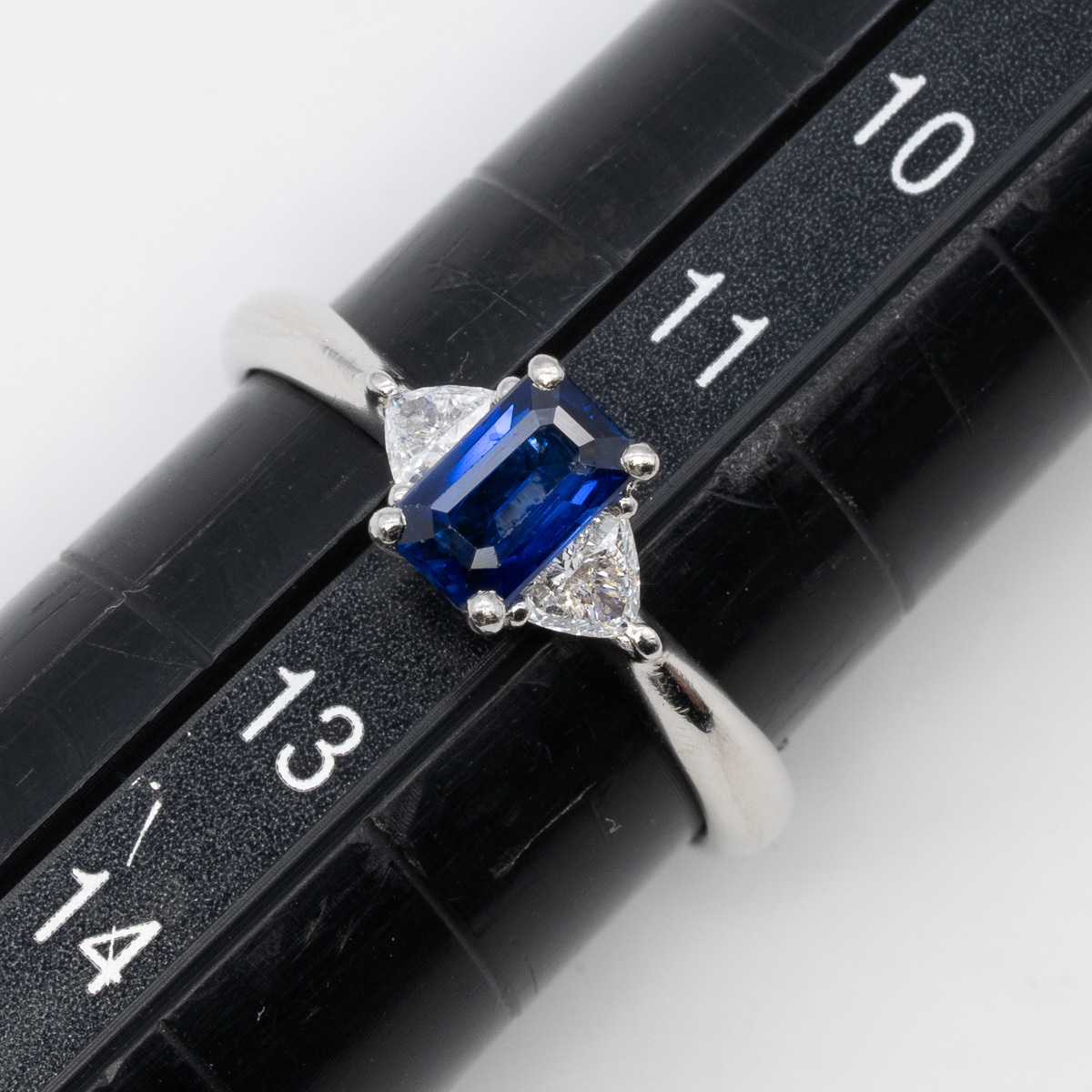 小粒ですが色の良いブルーサファイアを1石セッティングしたシンプルなリングです。両サイドにはトリリアントカットのダイヤモンドがセッティングされています。地金部分に僅かな小傷がございますが着用時は気にならい程度かと思います。