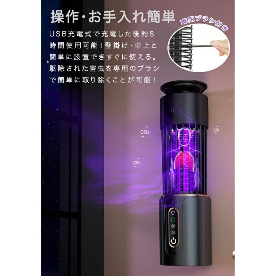 USB充電式で充電した後約8 時間使用可能!壁掛け・卓上と 簡単に設置できすぐに使える。 駆除された害虫を専用のブラシ で簡単に取り除くことが可能!