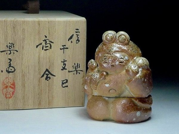 60YT17★茶道具 信楽焼 髙橋楽斎造 干支 己 香合 共箱付 共布付 蛇 縁起物 置物 飾り 小物入れ 香道具 高橋楽斎