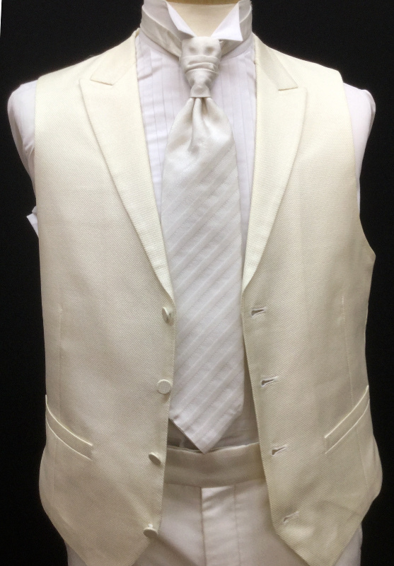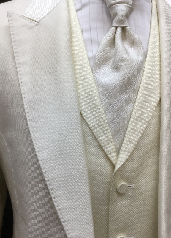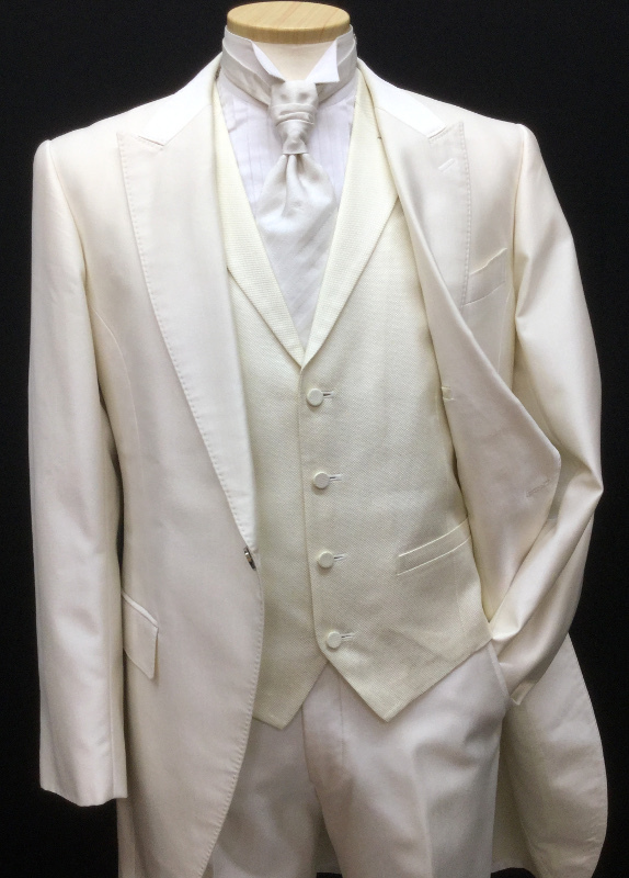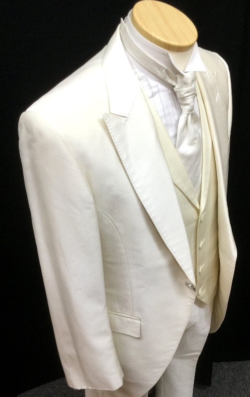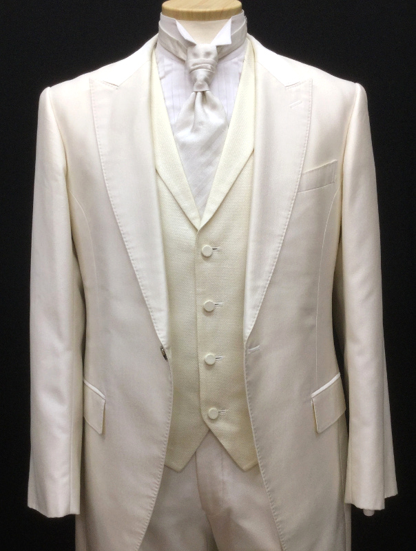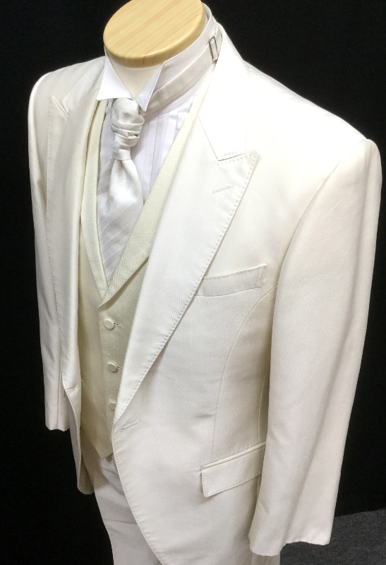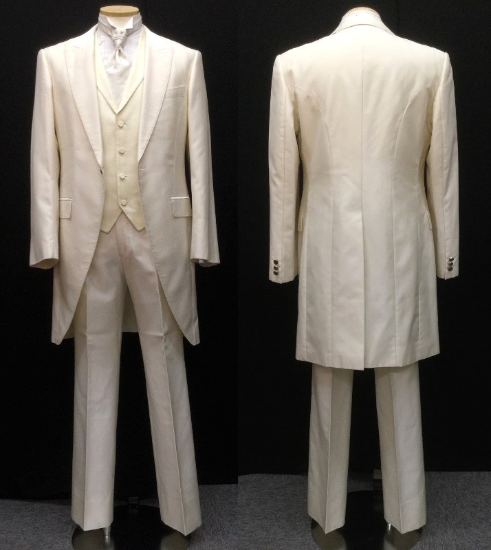 A-Mサイズ★オフ白光沢の無地生地★上衣前裾はモーニング風カット メタルボタン ベージュにラメ地のベスト クリスタルピン付きタイ 貸衣装店で使用・手入れされていた新郎用のロングタキシード 専門店で管理されていた衣裳ですので状態は良い方です ブライダルメーカー「クラウディア」のブランド「Forte Kuraudia」の商品 オフ白、無地の生地、光沢・張りのあるしっかりした生地 素材は表地がウール59%、ポリエステル41% 剣衿、左右のポケットは飾りでフラップ付 衿・前袷・両脇フラップの縁はステッチ加工 ボタンは模様が入ったシルバーメタルで頭が平のもの 前1ヶ、袖口にはそれぞれ3ヶづつ 上衣の前裾は丸くカーブしているモーニング風のデザイン、センターベント ベストはラメの入ったベージュ色の生地 素材はシルク30%、ポリエステル60%、ナイロン10% 衿が付いていて左右にポケット、前袷は頭が平の包みボタン タイはラメ入りの白銀のストライプ、クリスタルのピン付、ワンタッチの着脱式 (注)写真はピンをつけないで写しています 上衣と共生地のパンツはすっきりとしたノータック ウエストにはアジャスターが付いて、サイズ調節可能 【注意】写真のYシャツはイメージでセットではありません サイズ違いのタキシードの写真を利用、デザイン・色とも同じものです 写真と現品とではモニター等により多少色合いが違います 【寸法】A-Mサイズ173179 実寸法と計測方法は以下の通りです、現品を計測しています 着用される方のスーツ等で寸法を確認してください 計り方で多少の誤差が出ると思いますのでご了承下さい 上着丈91.5cm位 袖丈60cm位 肩幅45cm位 ウエスト77~93cm位(アジャスター付き) 股下78cm位 【計測方法】 肩幅・・・背中側の左右の袖の縫いつけを直線で計測 袖丈・・・袖の縫いつけから袖口までを真下で計測 上着丈・・・衿と背中心縫い目から裾までを計測 ウエスト・・・パンツの内側の周囲を計測 股下・・・・股の付け根から裾までを真下で計測 ※ヌード寸法ではありません。現品を当方で実測しています ※多少の誤差はあると思います 【状態について】 たたんだ状態での入荷・保管の為、たたみシワがあります 他、特に目立った汚れ等はありません 全体にはきれいな状態だと思います ただ、あくまでも貸衣裳店で使用していた中古品です こちらで見落とした小さなシミやキズがあるかもしれません ご了承の上でご入札下さい | |||