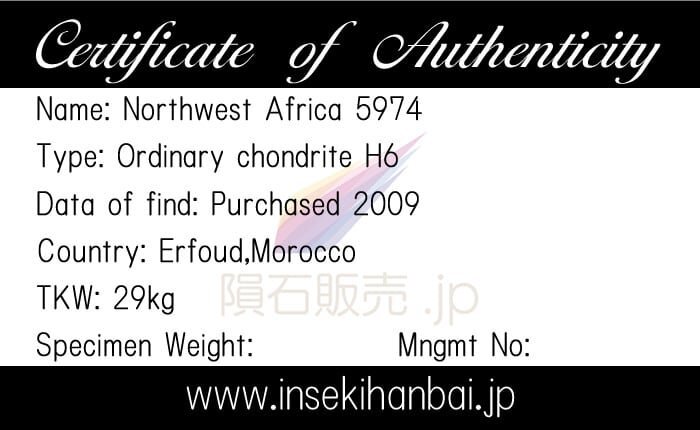 正式な隕石名はNorthwest Africa 5974です。サハラ砂漠で総質量19kgの塊を発見したモロッコの隕石ハンターがモロッコ東部にあるエルフォードの隕石マーケットで販売していたところ、MichaelFarmer氏が購入したことで登録されました。MichaelFarmer氏はこの隕石について「私のお気に入りの普通コンドライトの一つです。無傷で割れ目もなくほとんど風化していません。非常に多くの金属を含んでいて暗い母岩の中に鉄とニッケルの粒があり、まるで銀河のようにも見えます。この隕石が暗い宇宙にある何百万もの星の一つであると想像すると見る者を魅了します」と述べていました。