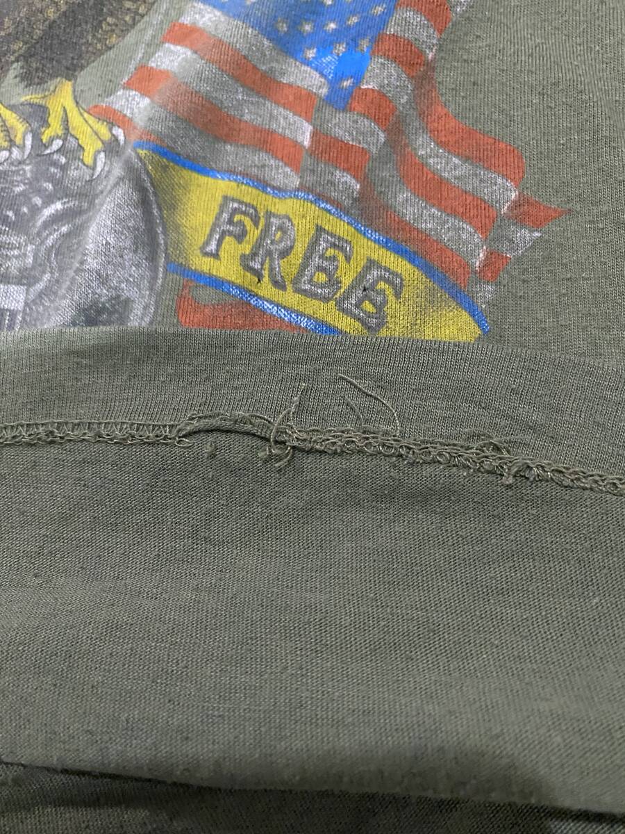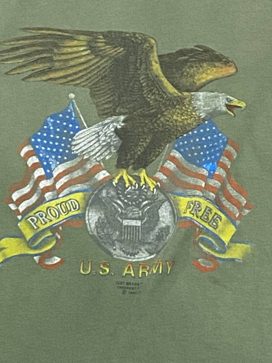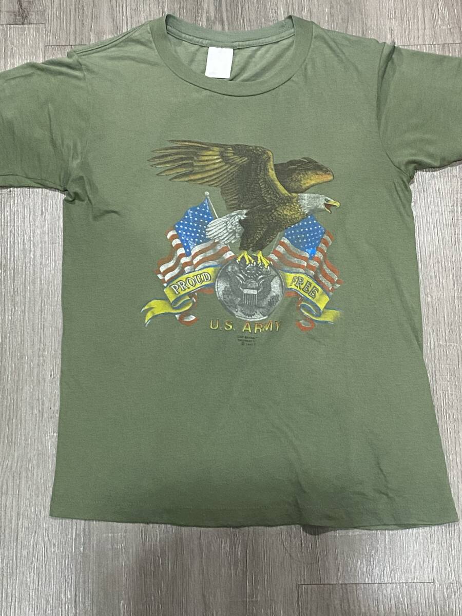 U.S.ARMY PROUD FREEの半袖Tシャツ サイズ不明 Mサイズ相当です。全体的に着用感がございます。また最後の写真の通り前の裾がほつれかかっております。