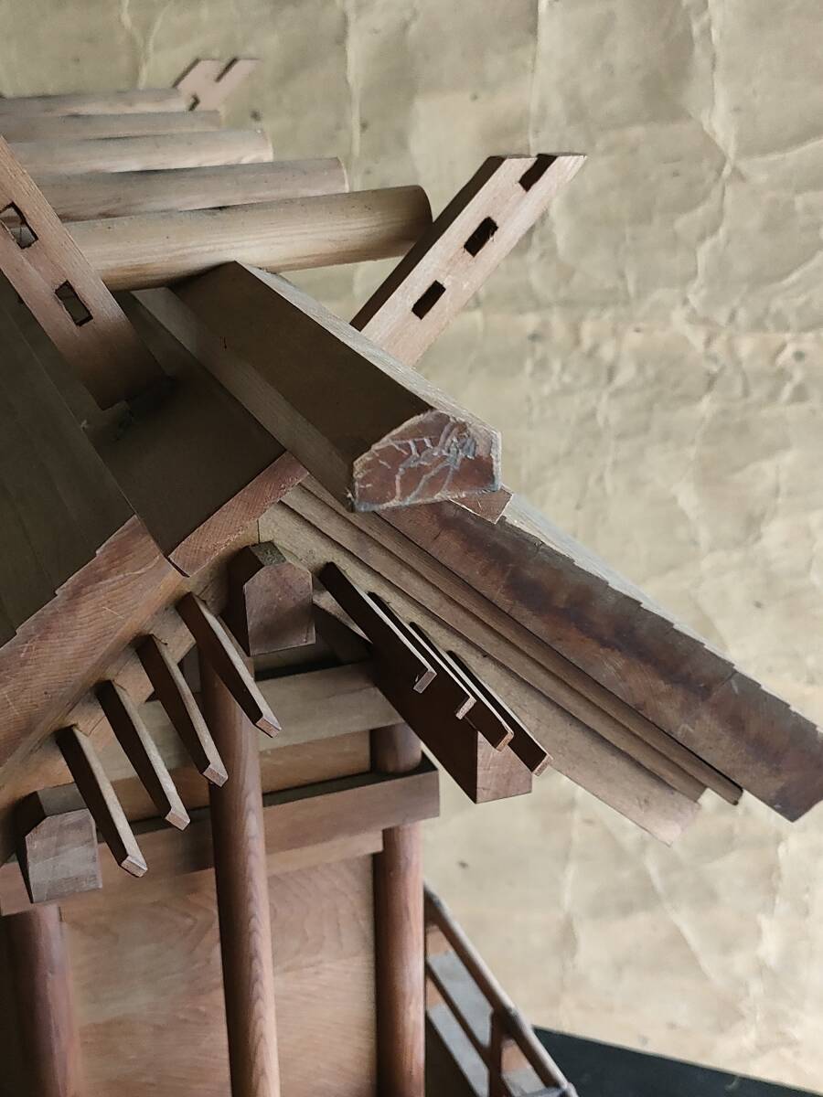 非常につくりの凝った木製の神社/厨子です。 所々部品の欠損が見られる部分もありますが、それを差し置いても、時代を感じさせる素晴らしい雰囲気、 全体に経年の灰色がかったしっとりとした良い木の色になっています。 |