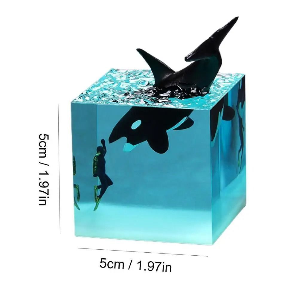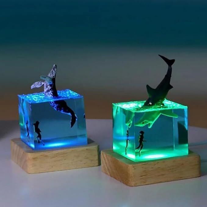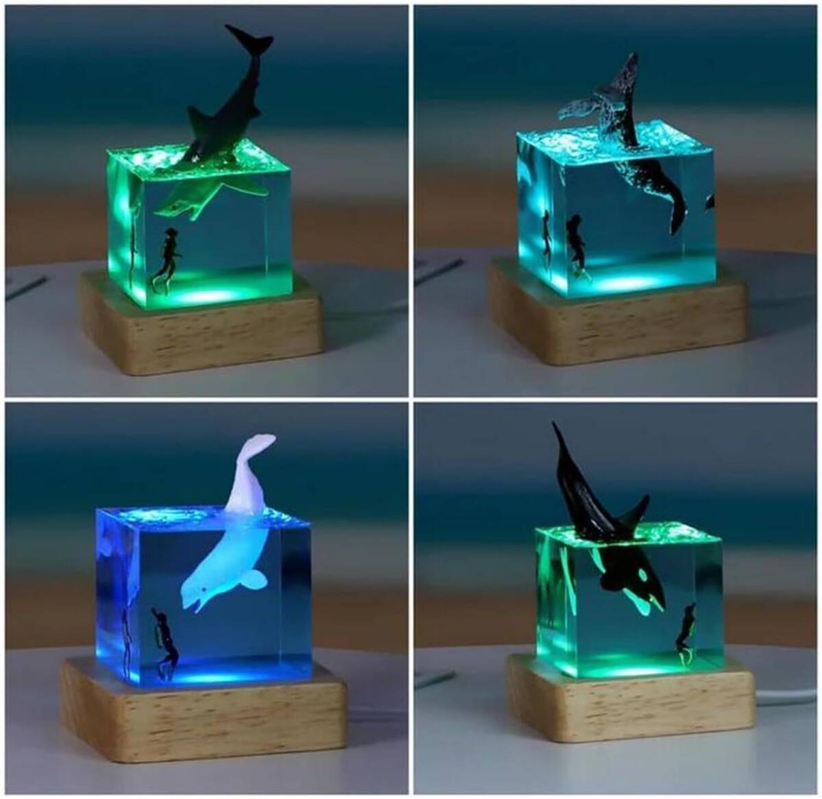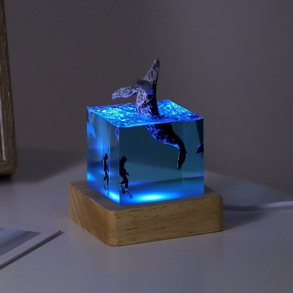 USBケーブル付きの木製台とエポキシ樹脂で作られたクジラは、美しいブルーの光を放った海からジャンプしています。