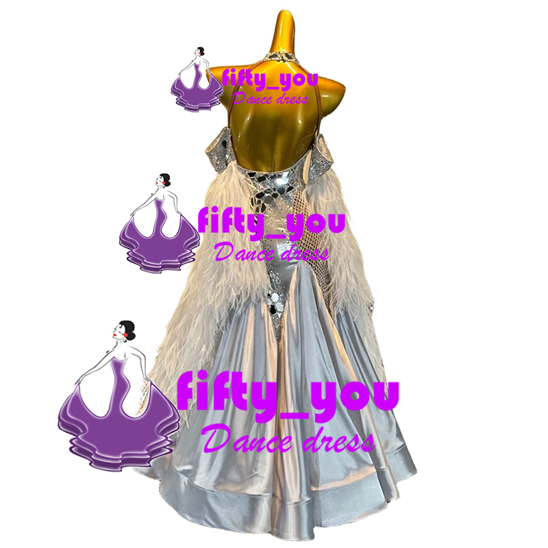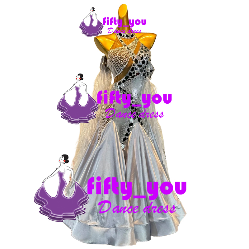 新品fifty_youレディース社交ダンス衣装  モダンドレス セミオーダー 競技高品質ドレス スタンダードドレス お洒落シルバー色