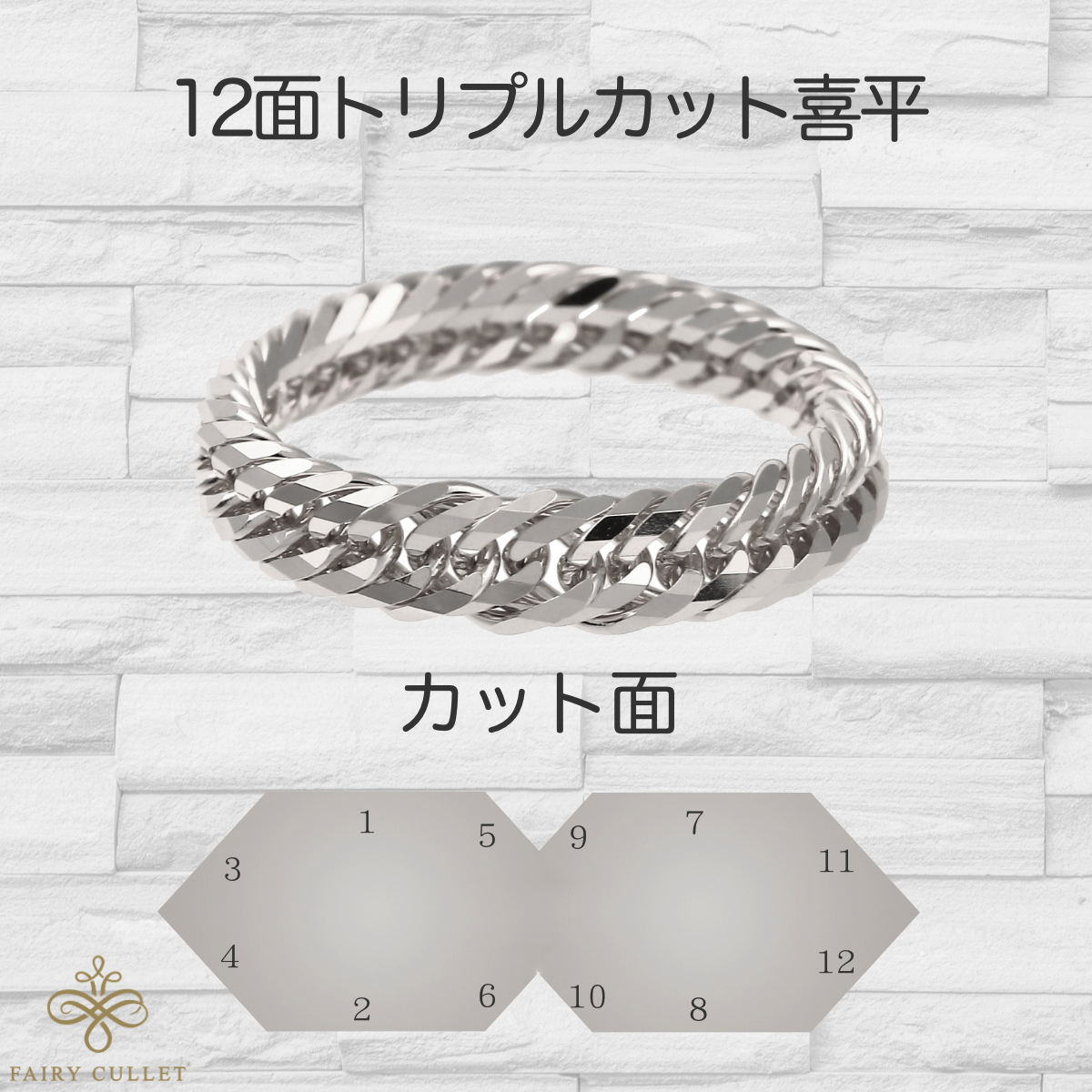 形状:12面トリプルカット喜平チェーン型リング。円形に溶接を行わない柔軟なリングです。