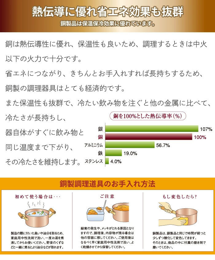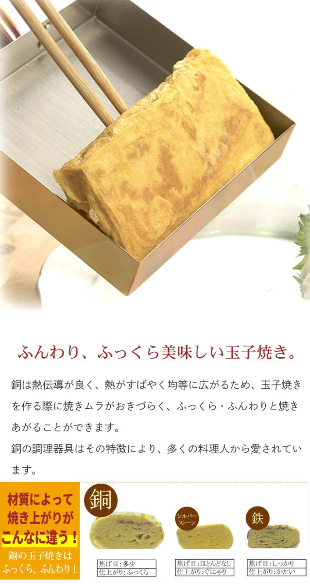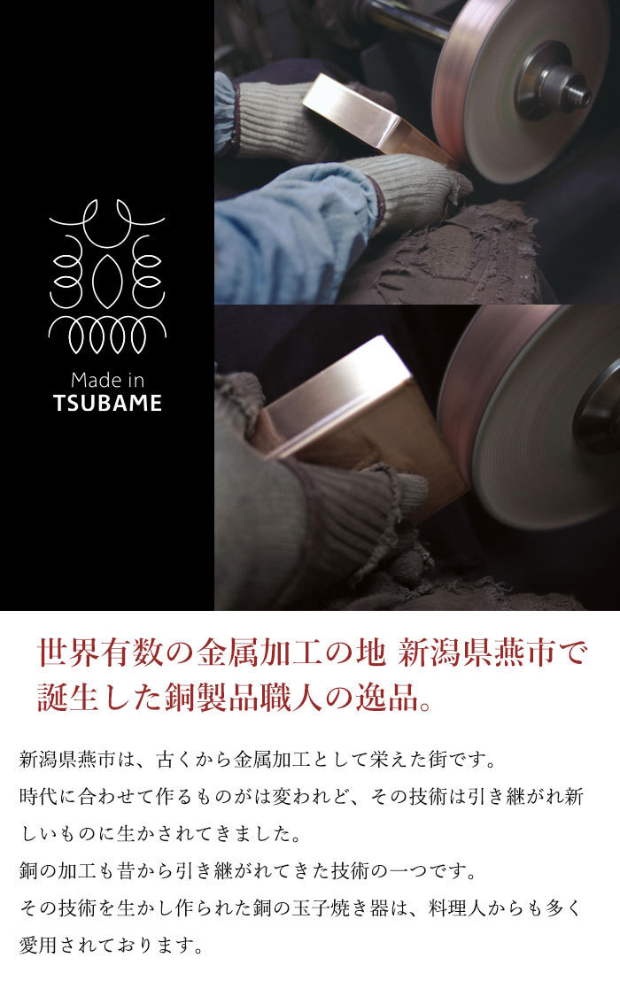 【メイド・イン・ツバメ認証マーク取得商品】 新潟県燕市で生産された製品の原産地と品質を「燕商工会議所」が審査・認証を行い、認定された製品です。 新潟県燕市の職人が作った純銅製の玉子焼き器です。 銅は熱伝導がよいため、熱がすばやく均等にひろがります。 その特性を生かし、玉子焼きを作る際も焼きムラがおきづらく、ふっくら・ふんわり焼き上げることができ、多くの料理人に愛用されています。 お手入れをしっかりしていただければ、一生モノとしてお使いいただける料理道具です。 木蓋付きです。 |