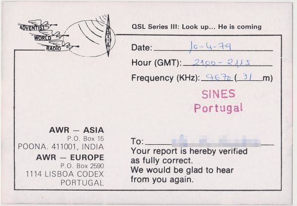 | 商品説明 | Adventist World Radio、シネス中継 のベリカードです。カード取得者の名前は出品上、画像から消してあります。 |