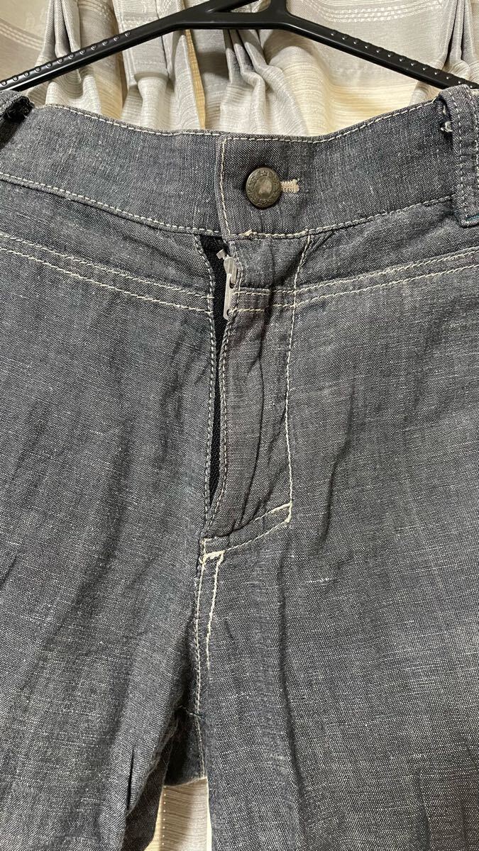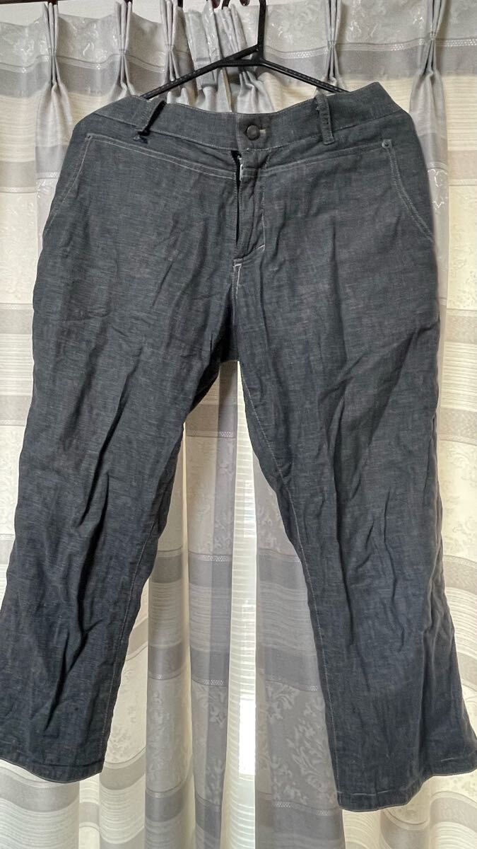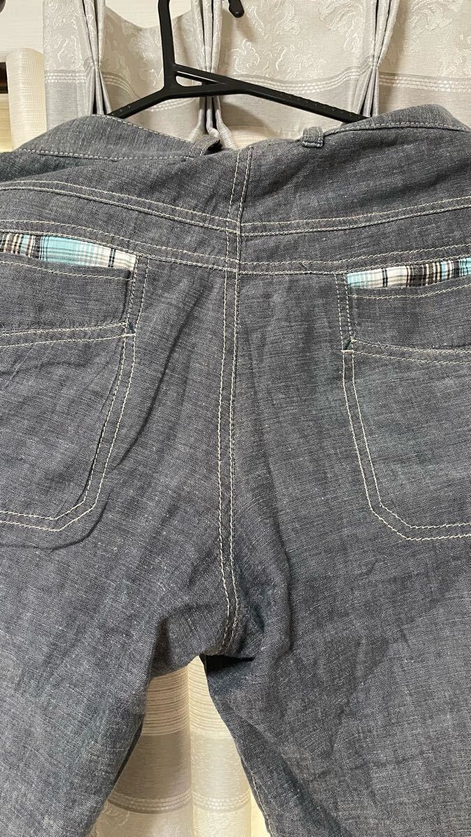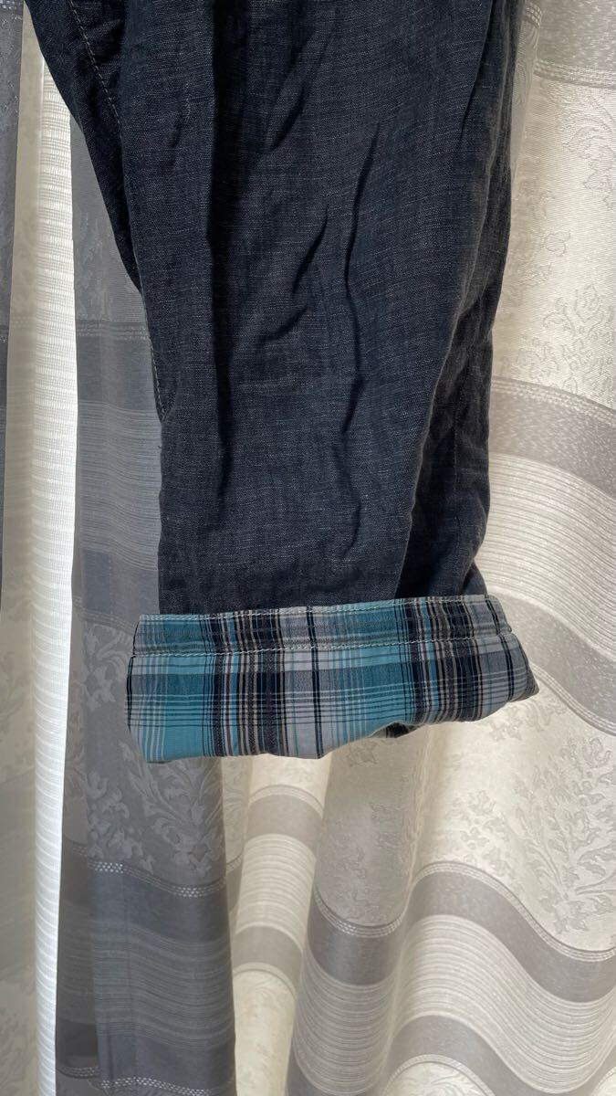 リバーシブルグレーのカジュアルパンツ、チェック柄の裾が特徴。